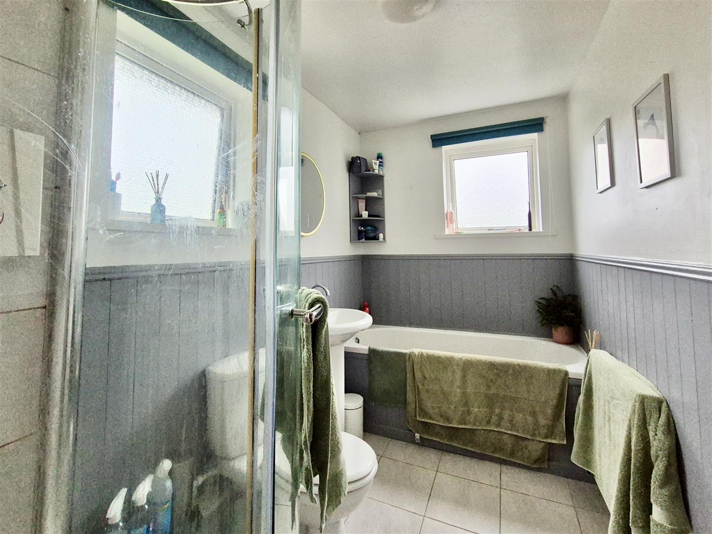 Bathroom - Comprising a shower cubicle, close coupled W.C., wash basin and a bath. There is a tiled floor and frosted window.