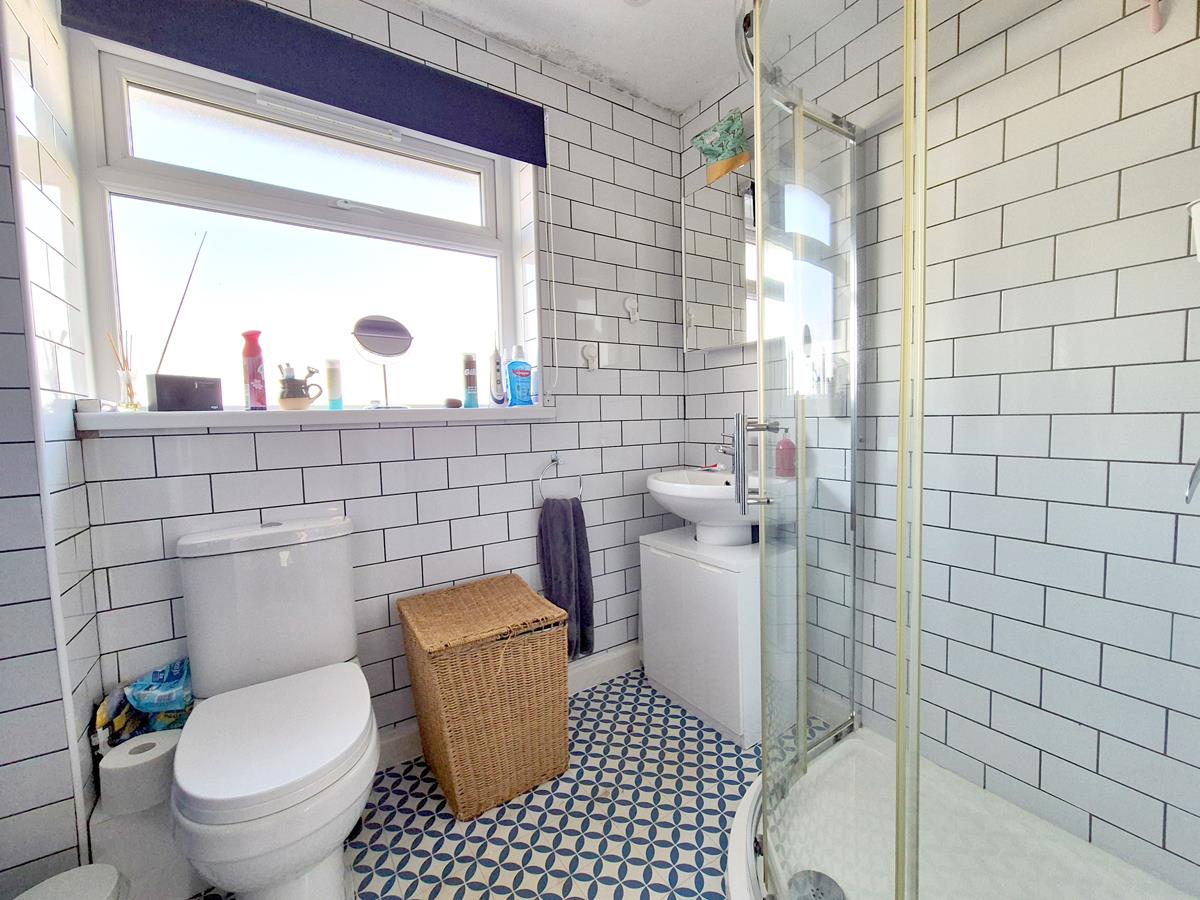 Shower Room - Comprising a close coupled W.C., pedestal wash basin with mixer tap and a shower cubicle. There is a heated towel rail, partially tiled walls and frosted window to the rear.