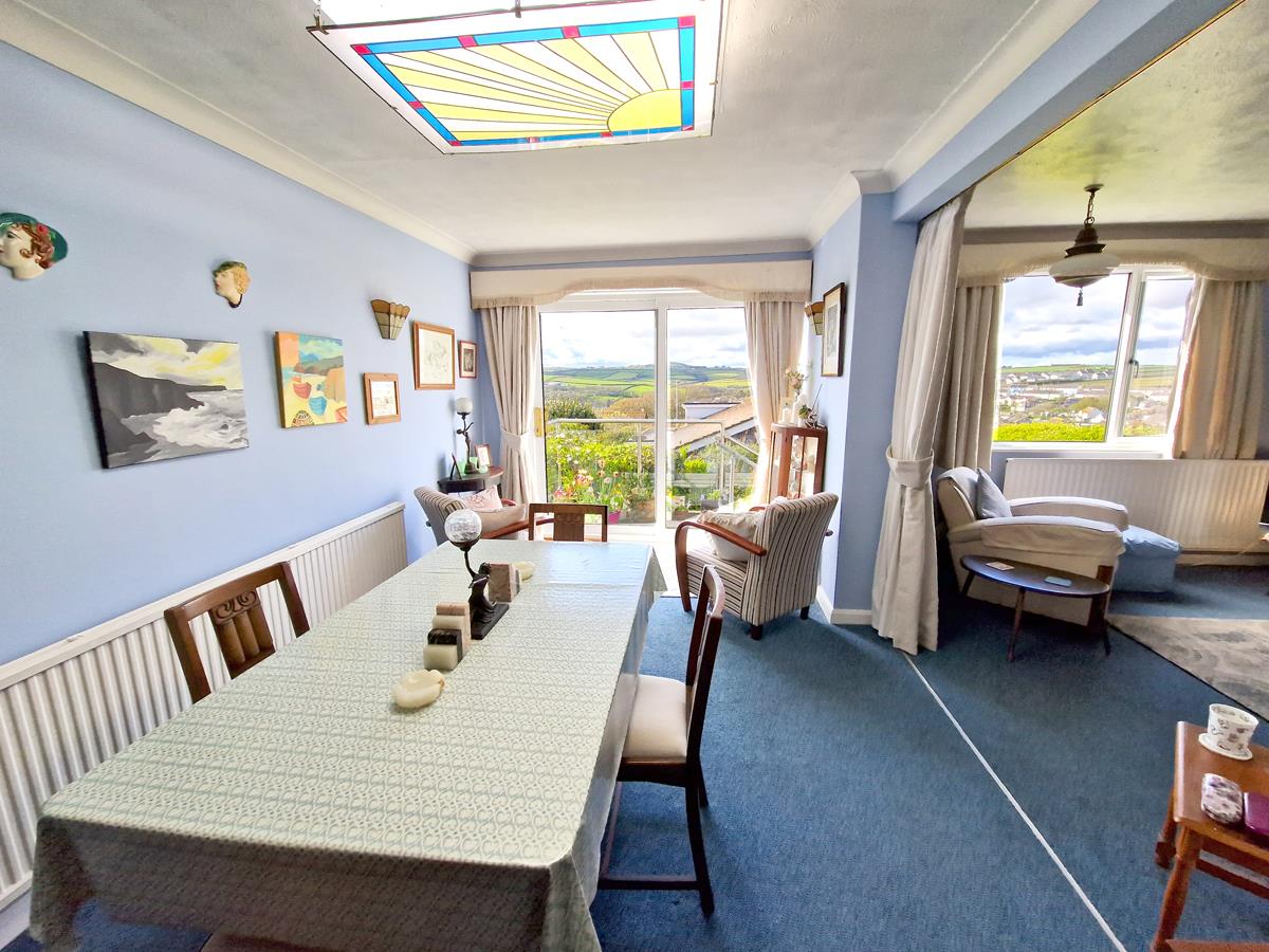 Lounge/Diner - 6.55m x 5.18m (21'6" x 17') - With views to the side, over the village, out to sea and the rugged Cornish coastline beyond. Patio doors open onto the garden. A fireplace acts as the focal point for the room with a wood burner, stone hearth, surround and mantel over.