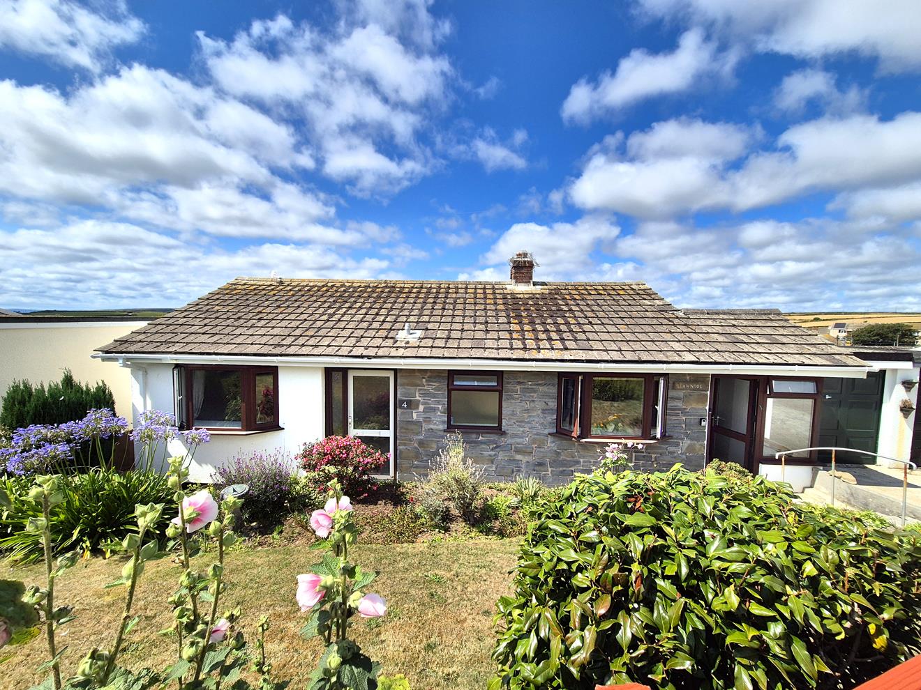 Enjoying far reaching views over open countryside, towards Tregonning Hill and distance sea glimpses, the property benefits from double glazing and has pleasant gardens to the front and rear. To the side, a driveway provides parking and leads to a garage.