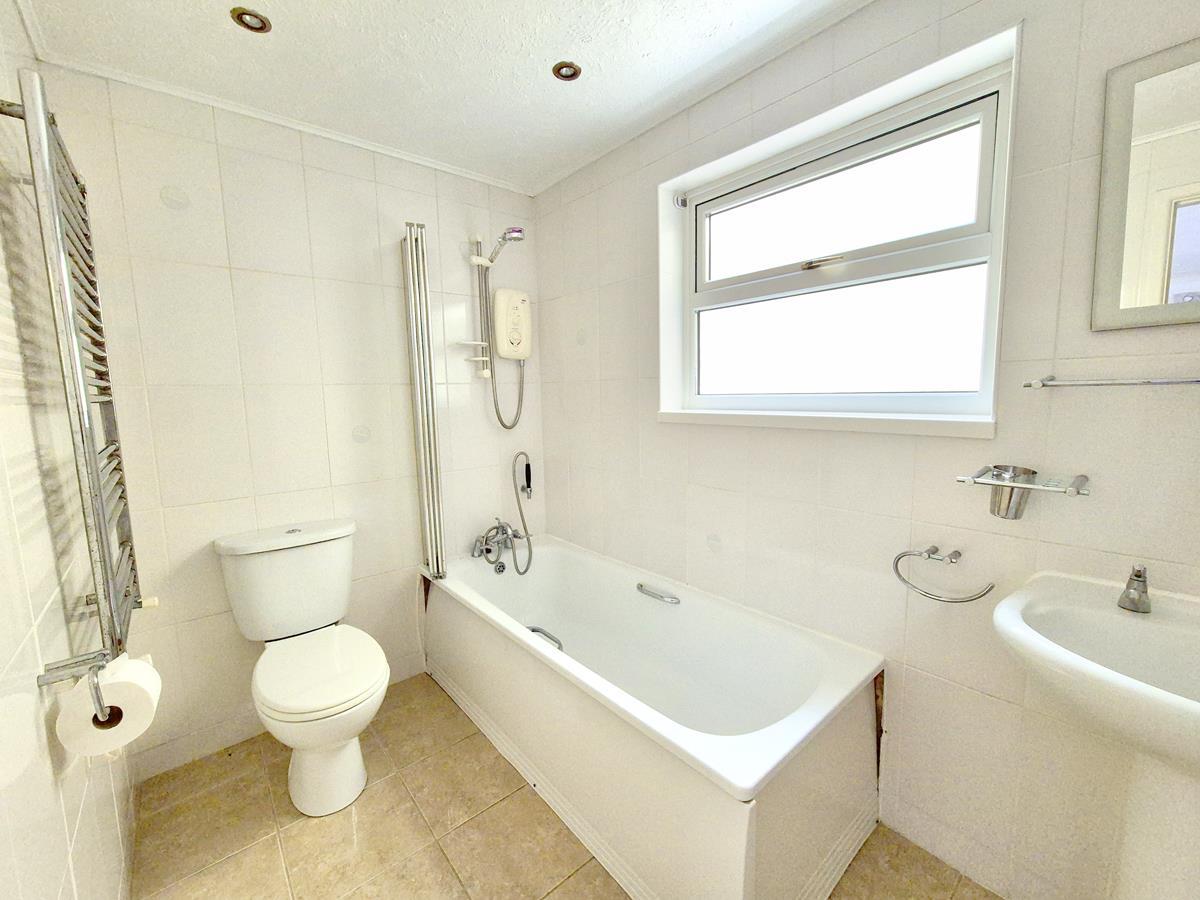 En Suite - Comprising a close coupled W.C., bath with shower over and mixer tap with flexible shower attachment and a pedestal washbasin. There are tiled walls, tiled floor and frosted window to the side.