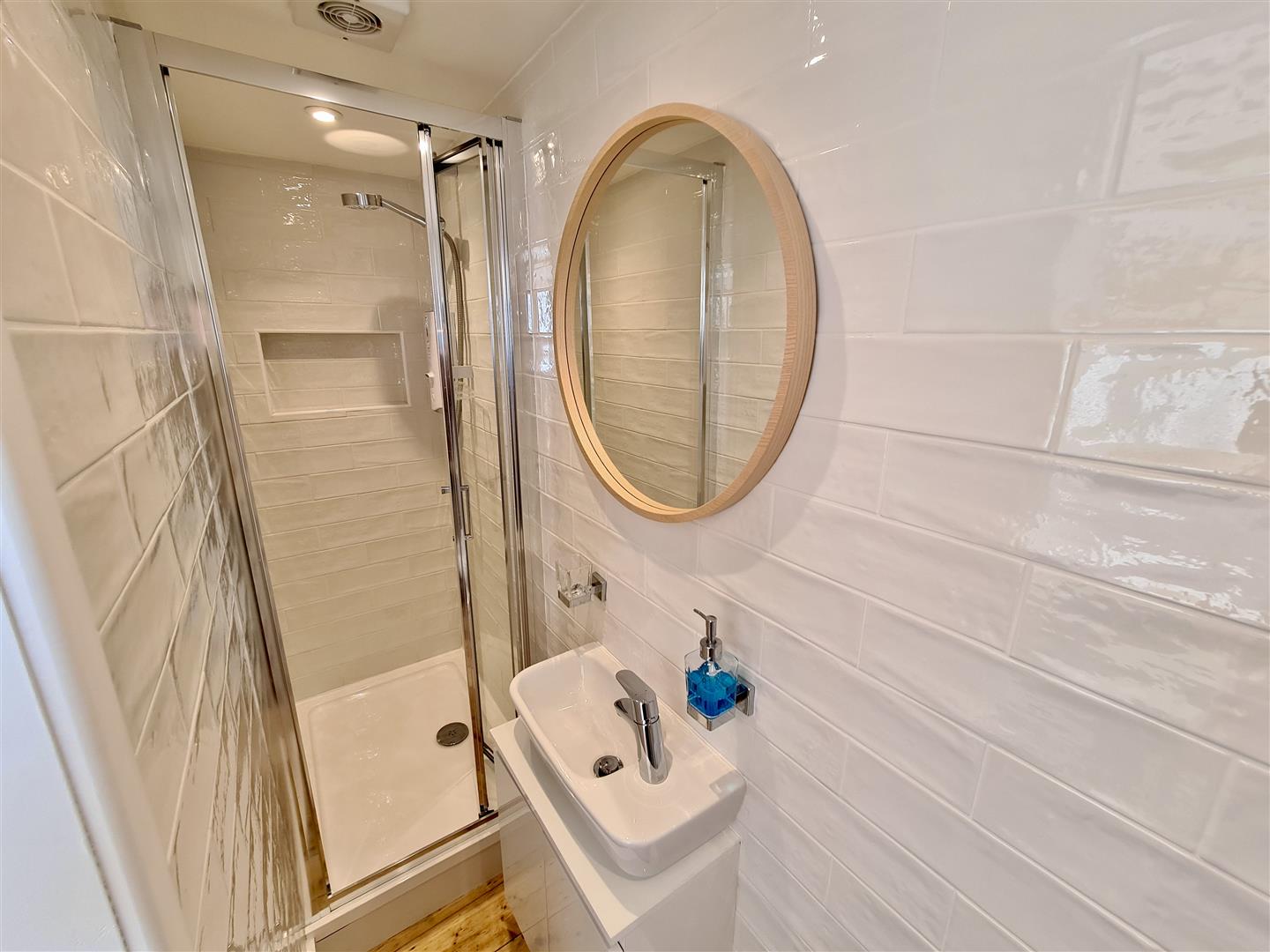En Suite - Comprising a shower cubicle with electric Myra shower, washbasin with cupboard over, close coupled W.C. and a heated towel rail. There are tiled walls, LED spotlighting and a wood floor.