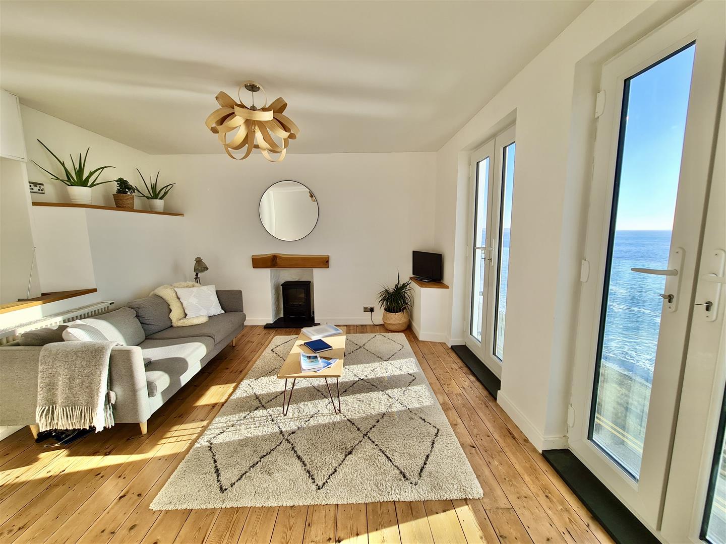 Lounge/Diner - 4.34m x 3.66m (14'3" x 12') - Enjoying simply stunning views out to sea, Porthleven Beach and towards the rugged Cornish coastline. French doors open to Juliet balconies to take full advantage of this fine outlook. The room has a wood floor, dining area and a feature fireplace with stone hearth and wood mantel over (not in working order). Stairs down to