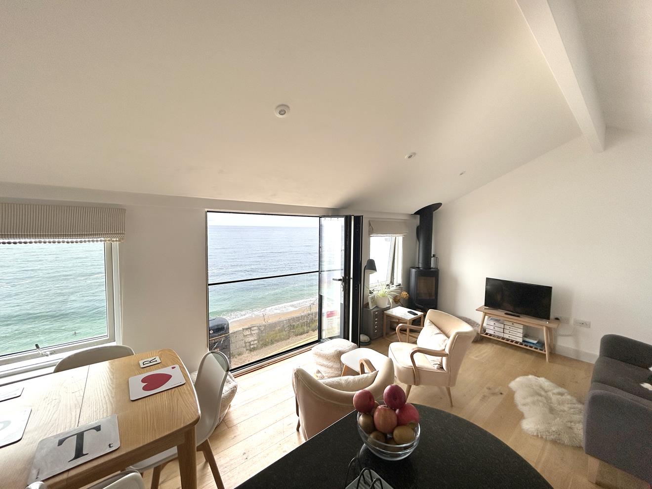Lounge/Kitchen/Diner - 5.72m x 4.11m (narrowing to 3.28m) (18'9" x 13'6" - A beautifully presented room commanding coast to coast views of The Lizard and Penwith Peninsulas. Triple glazed bifold doors with Juliet balcony and two windows. Storage cupboard with shoe rack and electricity meter. Wood burner with glass hearth, electric radiator, LED ceiling spot lights and a wooden floor.