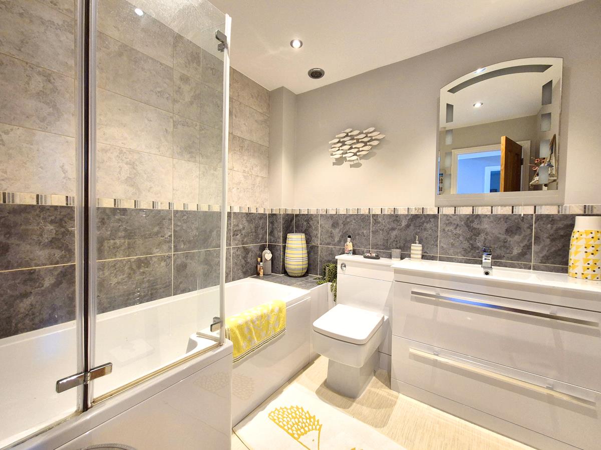 Bathroom - Comprising W.C. with concealed cistern, washbasin with surround and mixer tap over and drawers under. 'P' shaped bath with mixer tap and rain shower head over. There are partially tiled walls and a heated towel rail.