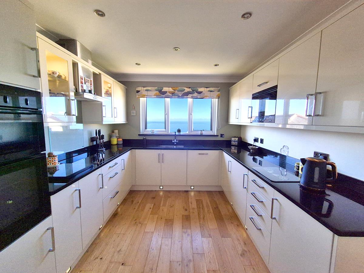 Kitchen - 3.89m x 2.90m (12'9" x 9'6") - With attractive granite working top surfaces incorporating a one and a half bowl sink unit with drainer and mixer tap over, cupboards and drawers under and wall cupboards over. Built-in appliances include a microwave, double oven, fridge/freezer and a dishwasher. The room has a wood floor and outlook over properties and out to sea.