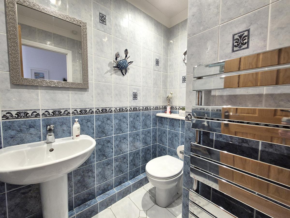 W.C. - Comprising a W.C. with concealed cistern and a pedestal washbasin with mixer tap. There is a heated towel rail, tiled floor and tiled walls.