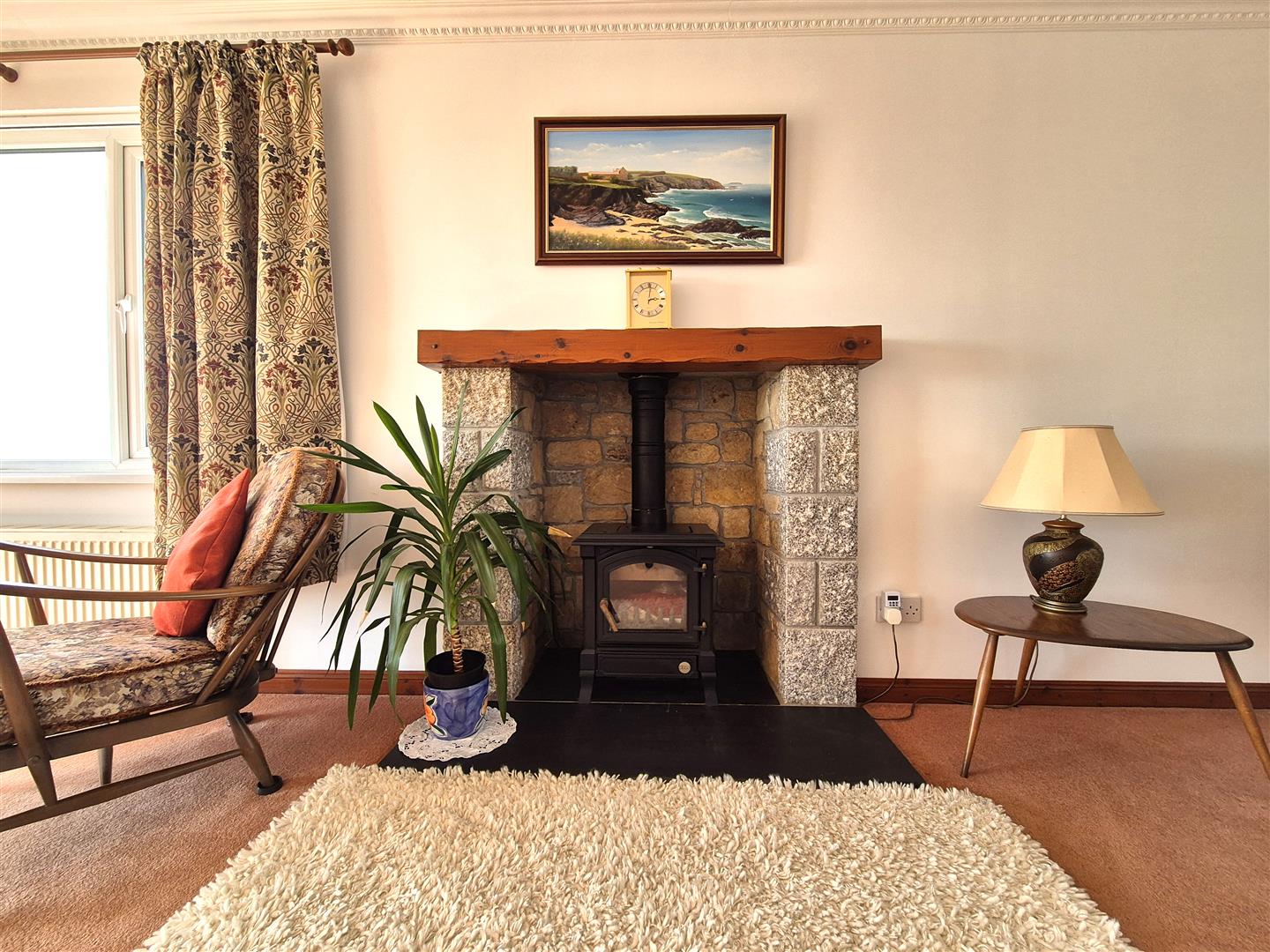 Lounge - 7.47m x 3.58m (24'6" x 11'9") - A dual aspect room with fabulous views over the village, out to sea and towards the rugged Cornish coastline. Patio doors open onto the balcony which allows one to sit back and take full advantage of the fine vistas. There is a feature fireplace with tiled hearth, wood mantel over and stone surround, housing a wood burner. With views over other properties and out to sea.