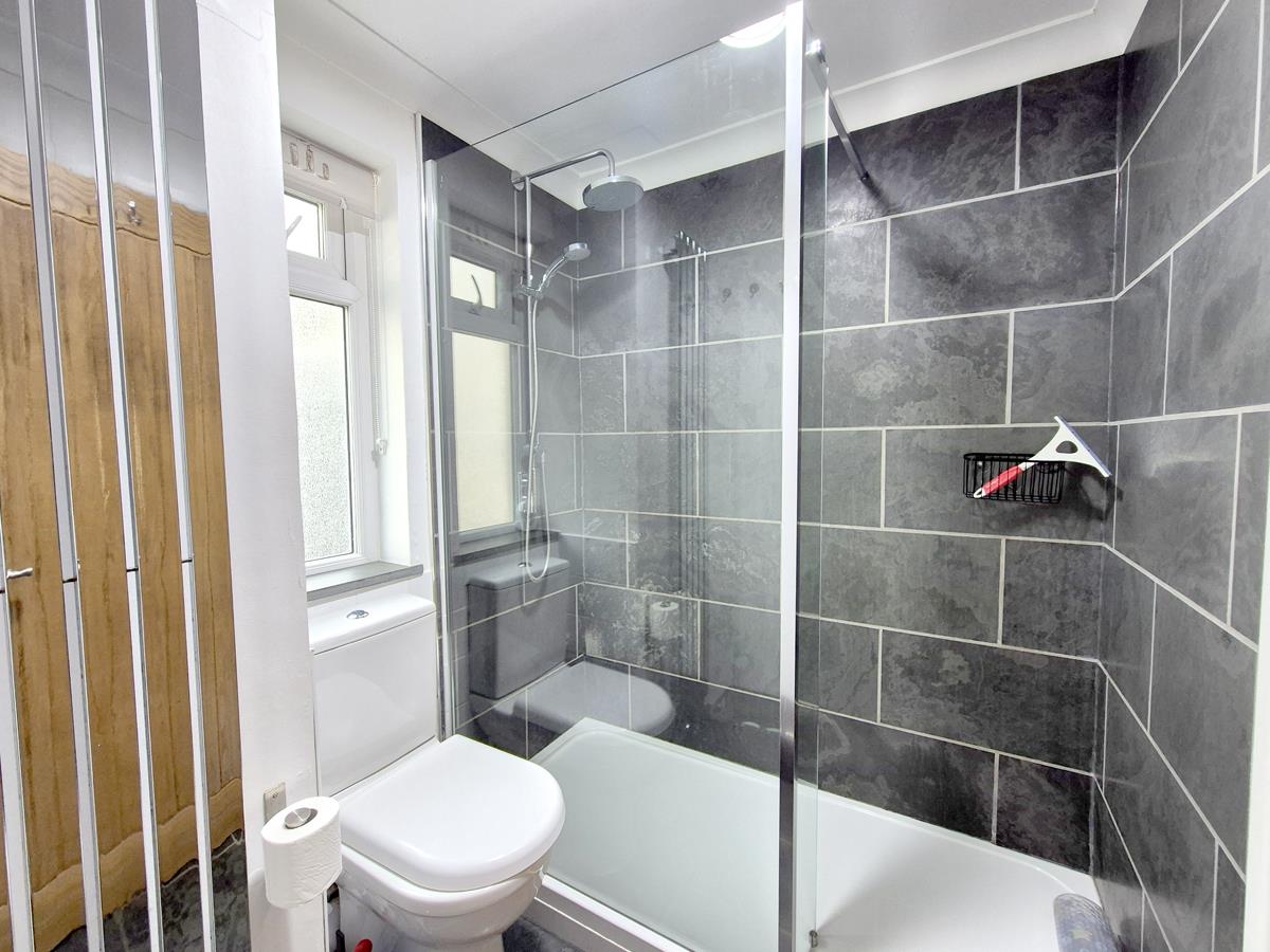 Shower Room - Comprising a close coupled W.C., walk-in shower cubicle with both rain and flexible shower heads, wash basin with waterfall style tap over and drawers under. There is a tiled floor, partially tiled walls, a heated towel rail and a frosted window to the side.