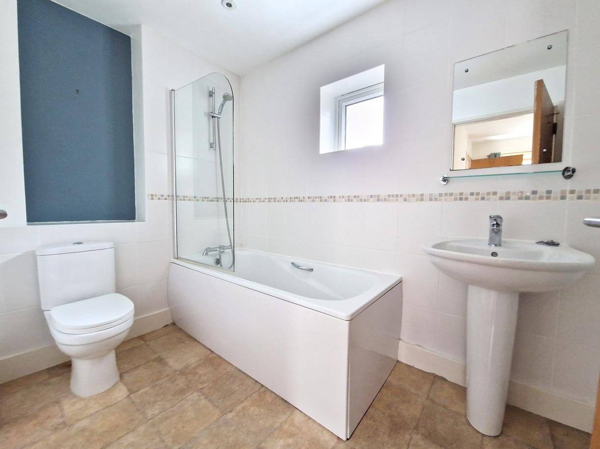 En Suite - Bath with mixer tap and flexible shower attachment, pedestal washbasin with mixer tap over and a close coupled W.C. The room has partially tiled walls, a window with frosted glass to the rear and an airing cupboard housing a water tank with immersion heater.