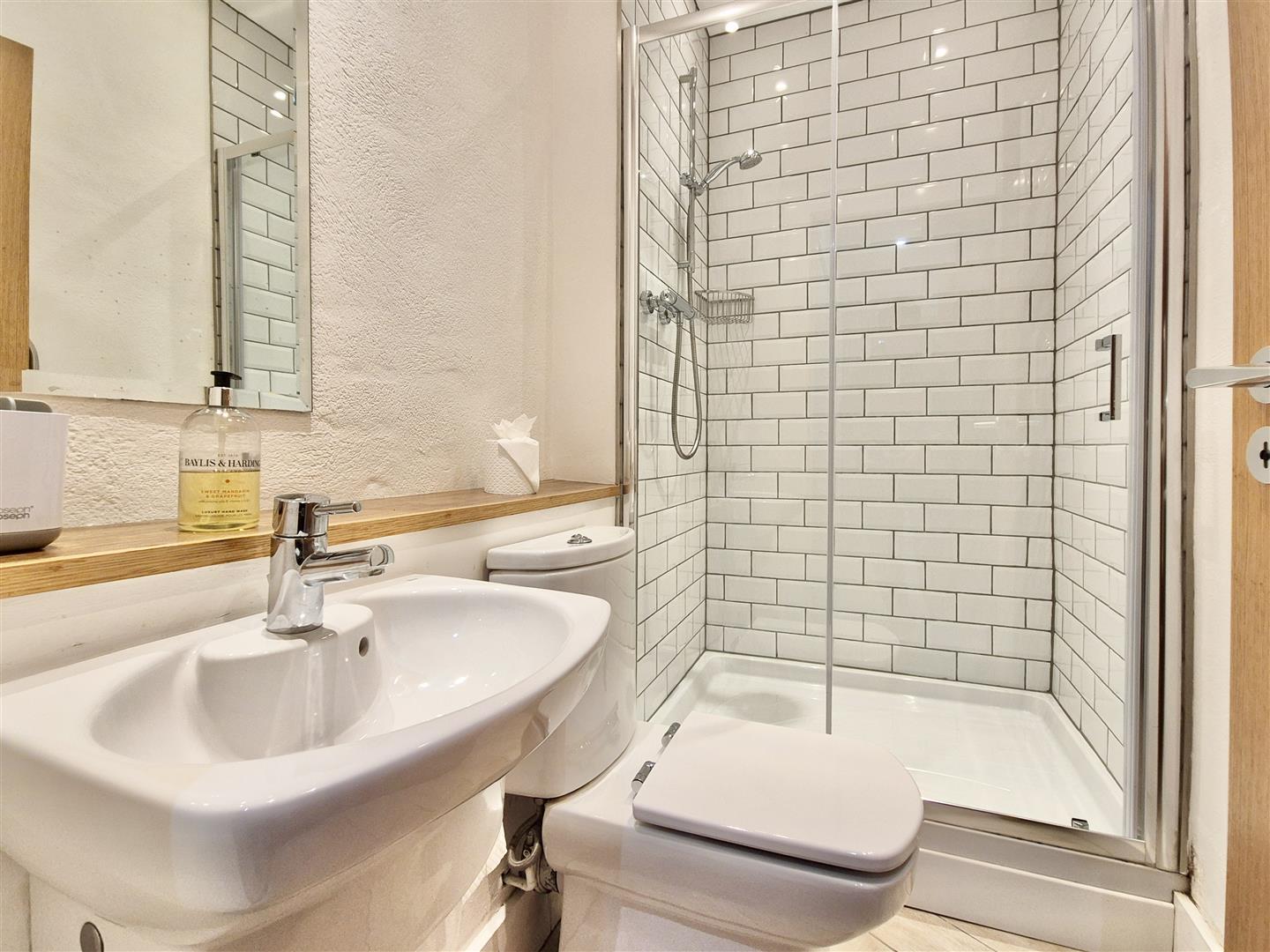 En Suite - Nicely appointed with Roca sanitary ware and comprising a low-level w.c., mounted wash han basin with mixer tap over and a large walk-in shower cubicle with a glazed sliding door, housing a thermostatic shower with attractive 'metro' style tiling. There is a wooden display shelf, shaving point, chrome towel rail, an extractor fan and luxury vinyl flooring.