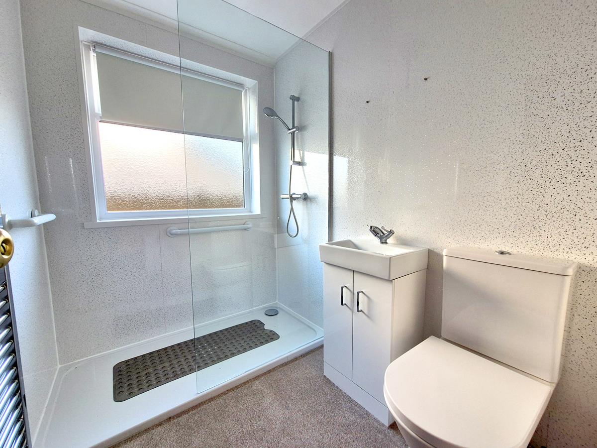 Shower Room - 2.13m x 1.57m (7' x 5'2") - Having been recently updated this is a lovely modern shower room with walk-in shower, wash hand basin in vanity unit, high rise W.C., chrome effect ladder style radiator, obscured window to side and practical and attractive aqua panelling fitted to the walls.