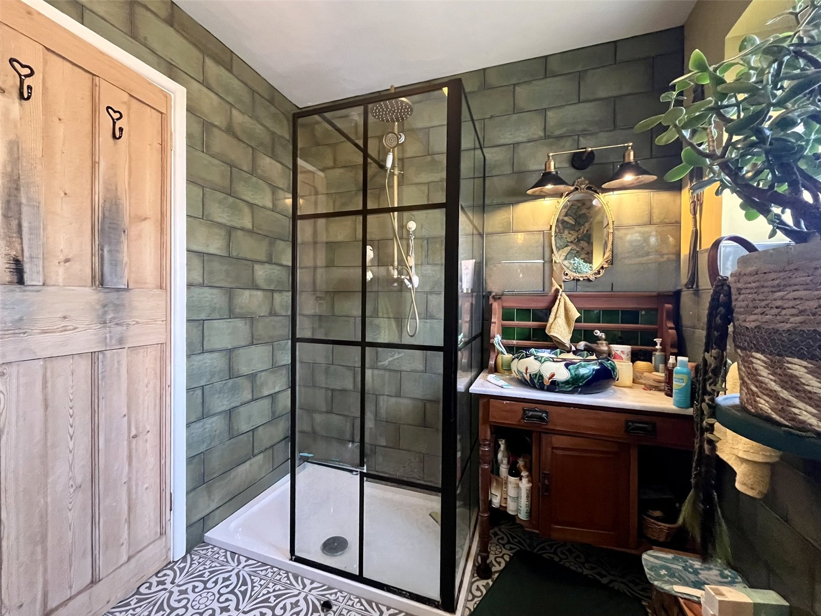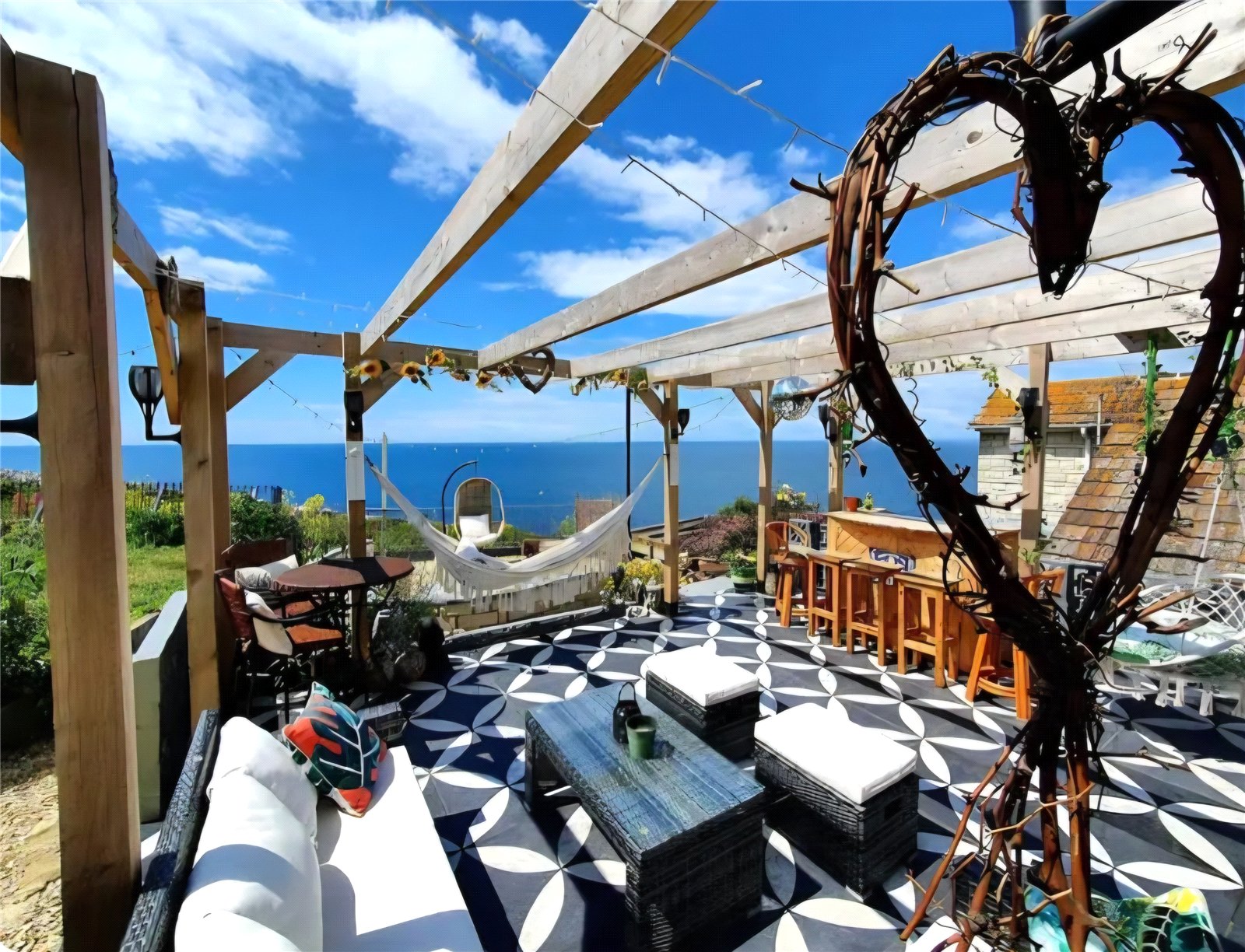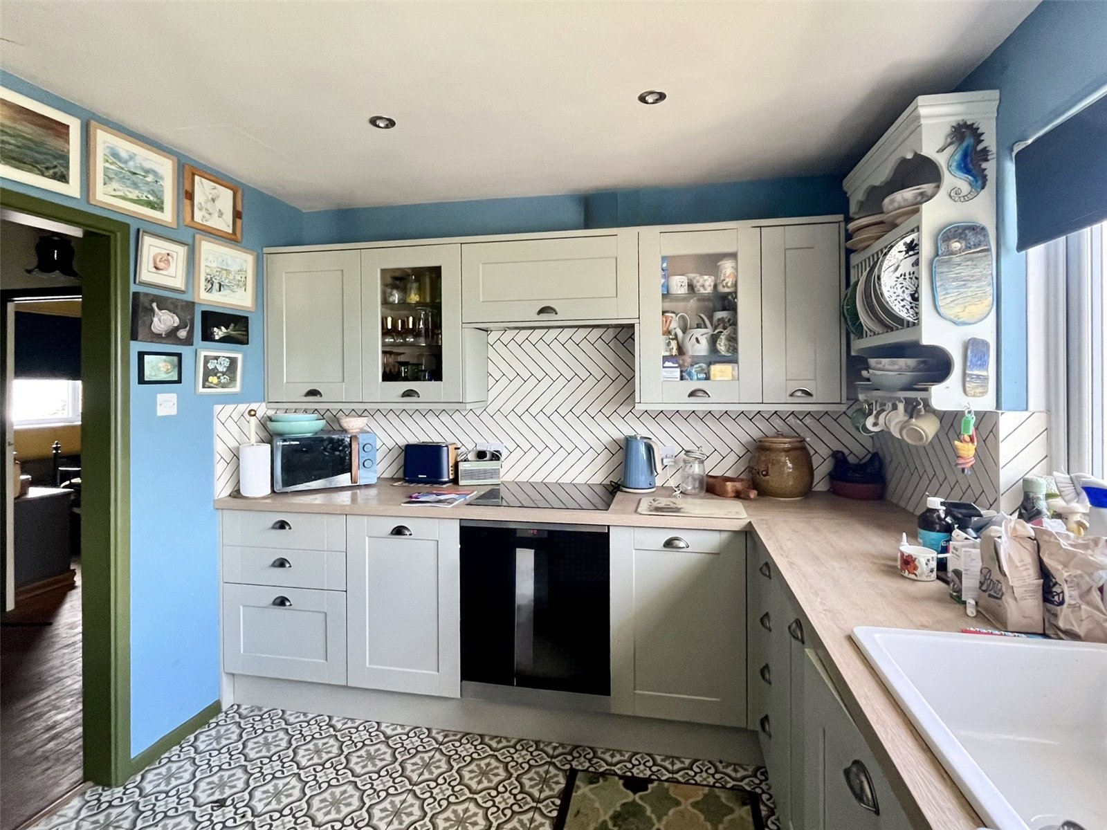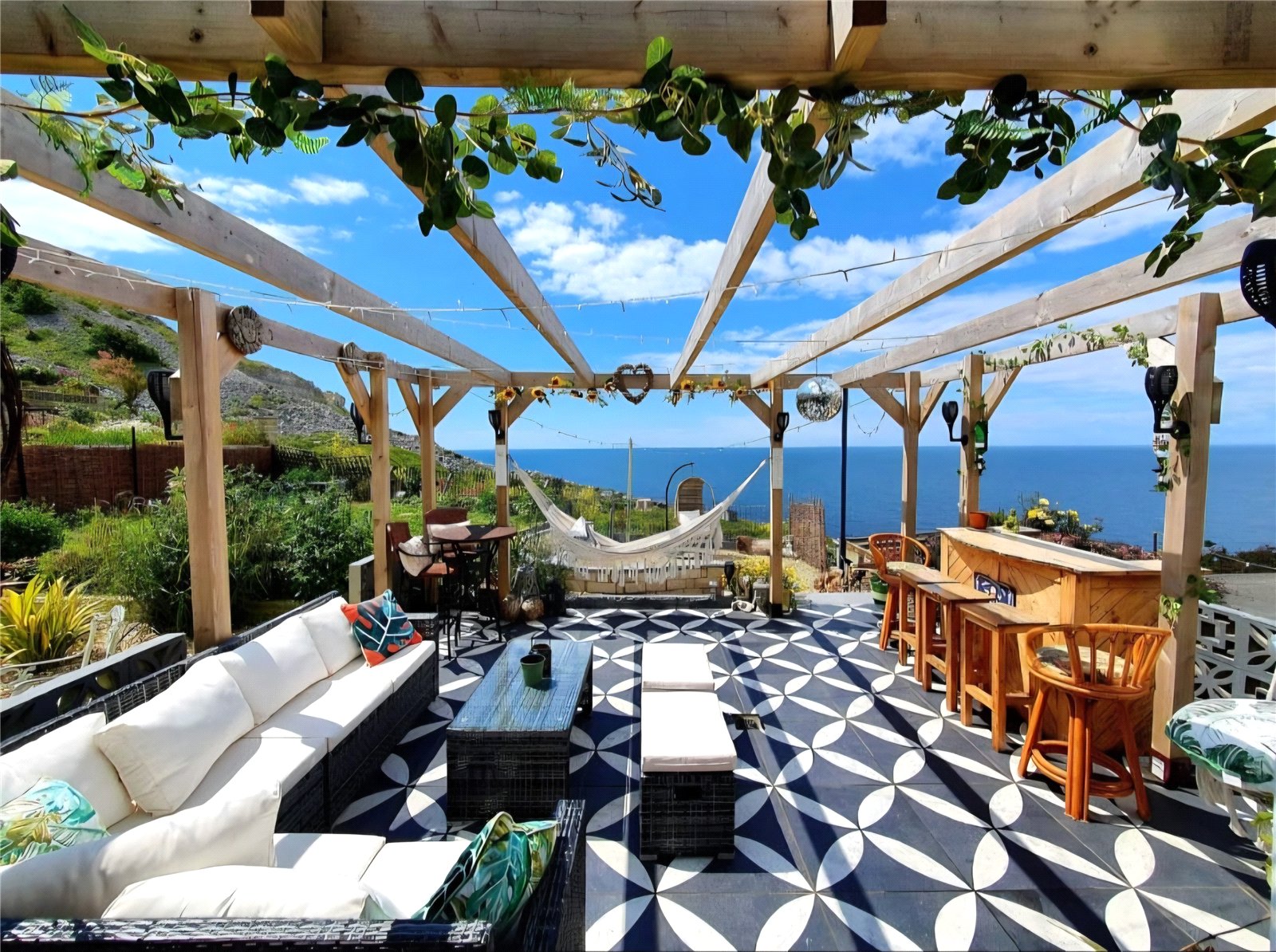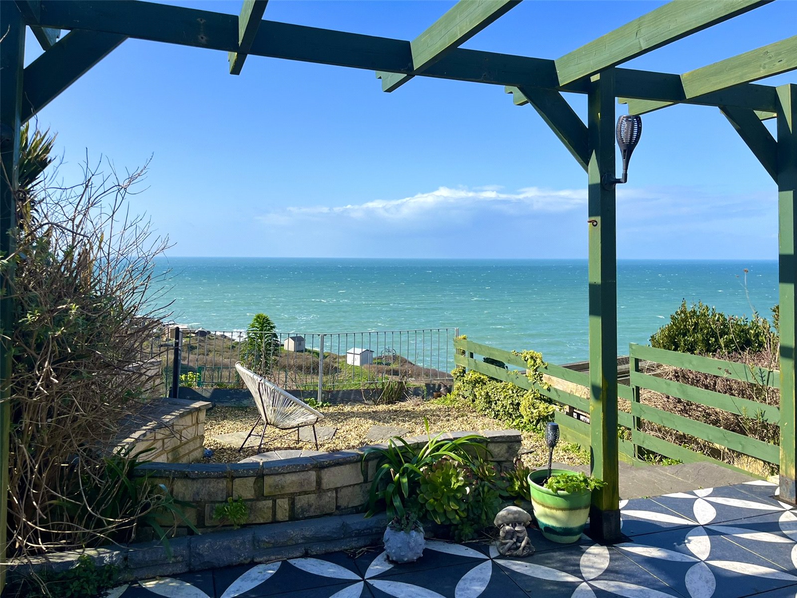 The well-proportioned kitchen continues the effortless flow, offering practicality and direct access to the rear garden—perfect for al fresco dining. The contemporary bathroom features a walk-in shower, patterned porcelain basin, and modern fittings. Externally, a sunny patio leads to a terraced garden and summerhouse, each space taking full advantage of the panoramic sea views. A gate opens onto the Southwest Coast Path, with Chesil Beach, The Cove Pub, Quiddles Café and Portland Marina all within walking distance.