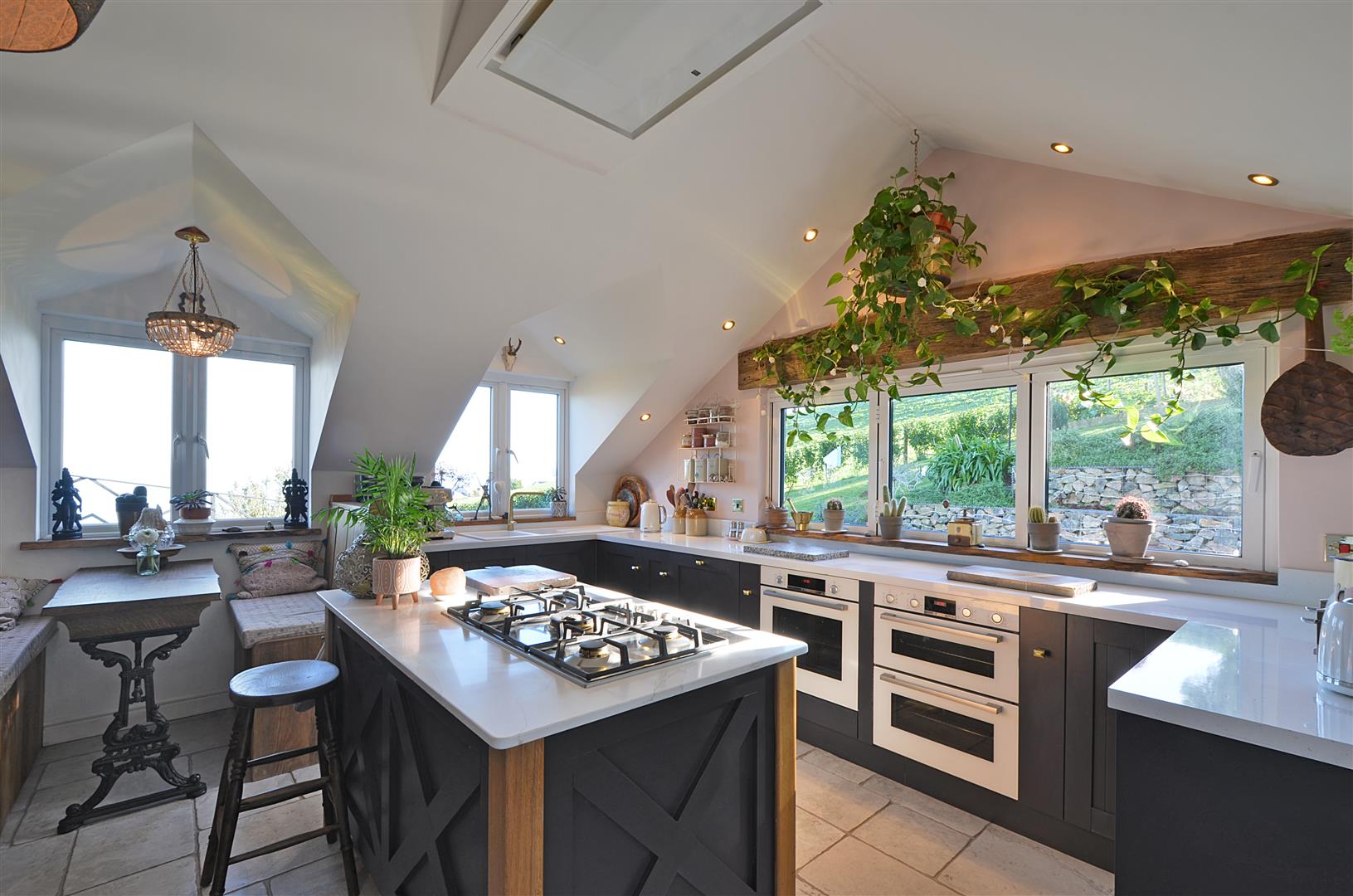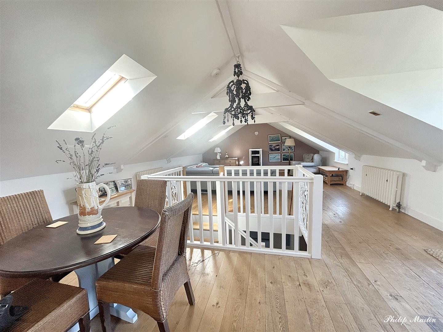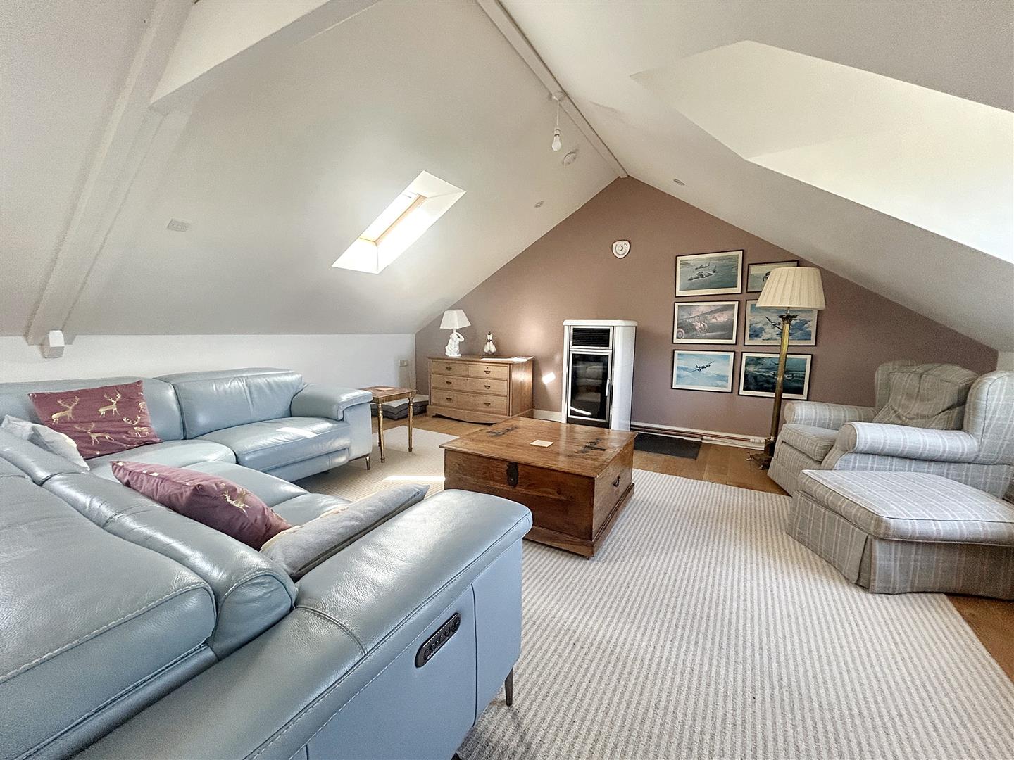 Sitting/Dining Room - 9.76m x 5.71m (32'0" x 18'8") - French doors opening onto a balcony with access into the front garden and dormer window both enjoying fabulous countryside, sea and coastal views. Exposed roof trusses, solid oak floor, two radiators, telephone and television points, three velux windows. Feature Klover biomass boiler which looks like a wood burning stove but heats the radiators throughout the house. Stairs to ground floor.