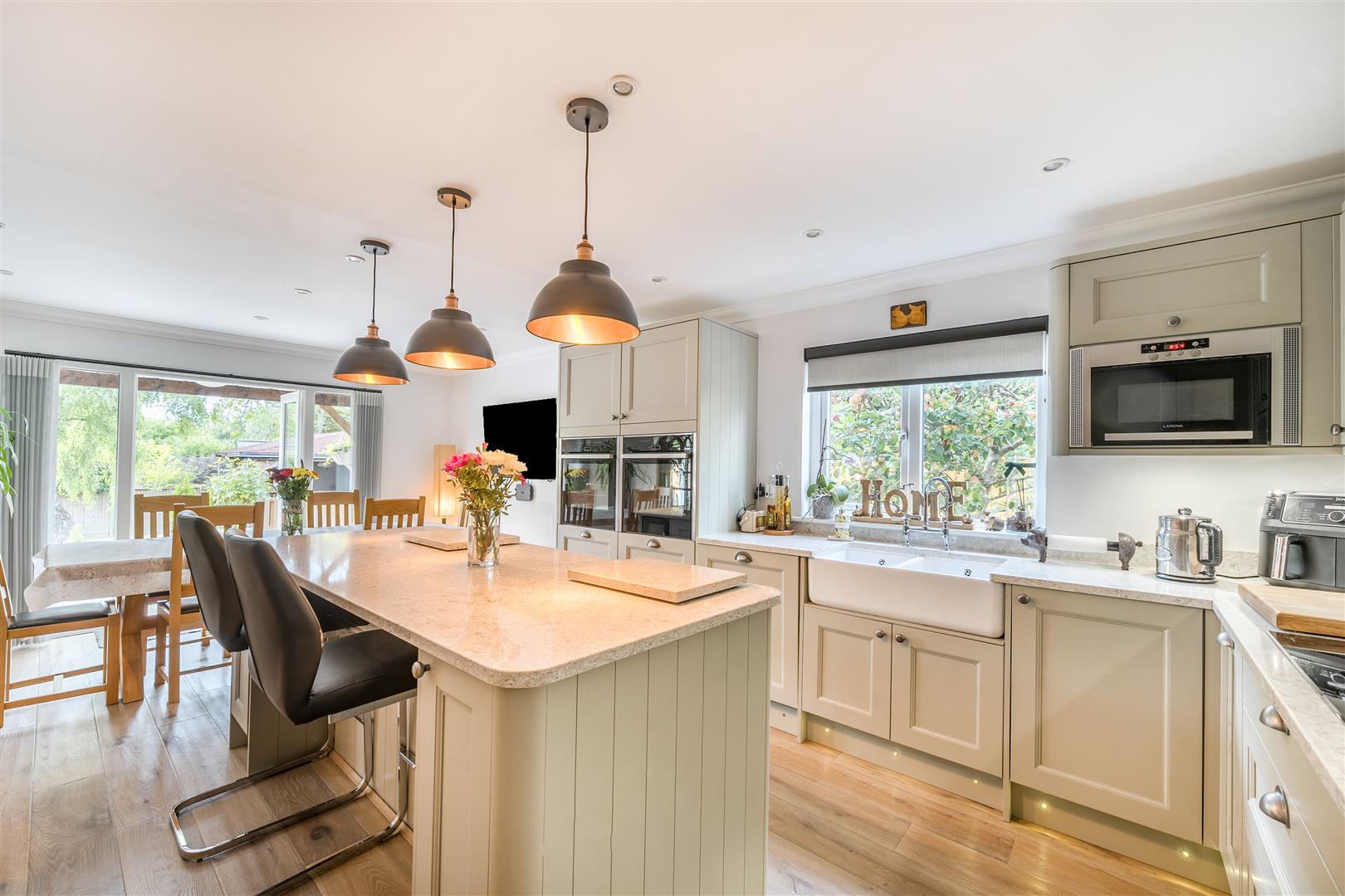 The kitchen/dining room has a high specification with inset spotlights and numerous cupboards and drawers with Quartz work surfaces over. It has an integrated microwave, freezer, full height fridge, dishwasher, two electric ovens and a five ring hob with extractor over. There is a central island with a breakfast bar and built-in wine cooler and freezer. There is a Belfast style double sink with space for a table and chairs and French doors again leading to the garden. Leading from the kitchen is a utility room, beyond which is the integral garage with two up and over doors, power and light and a door to the rear.