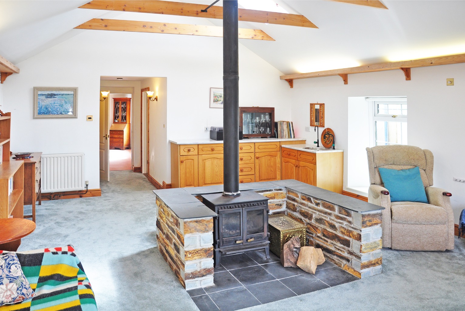 - Magnificent living room with a vaulted ceiling and centrally placed featured wood burner