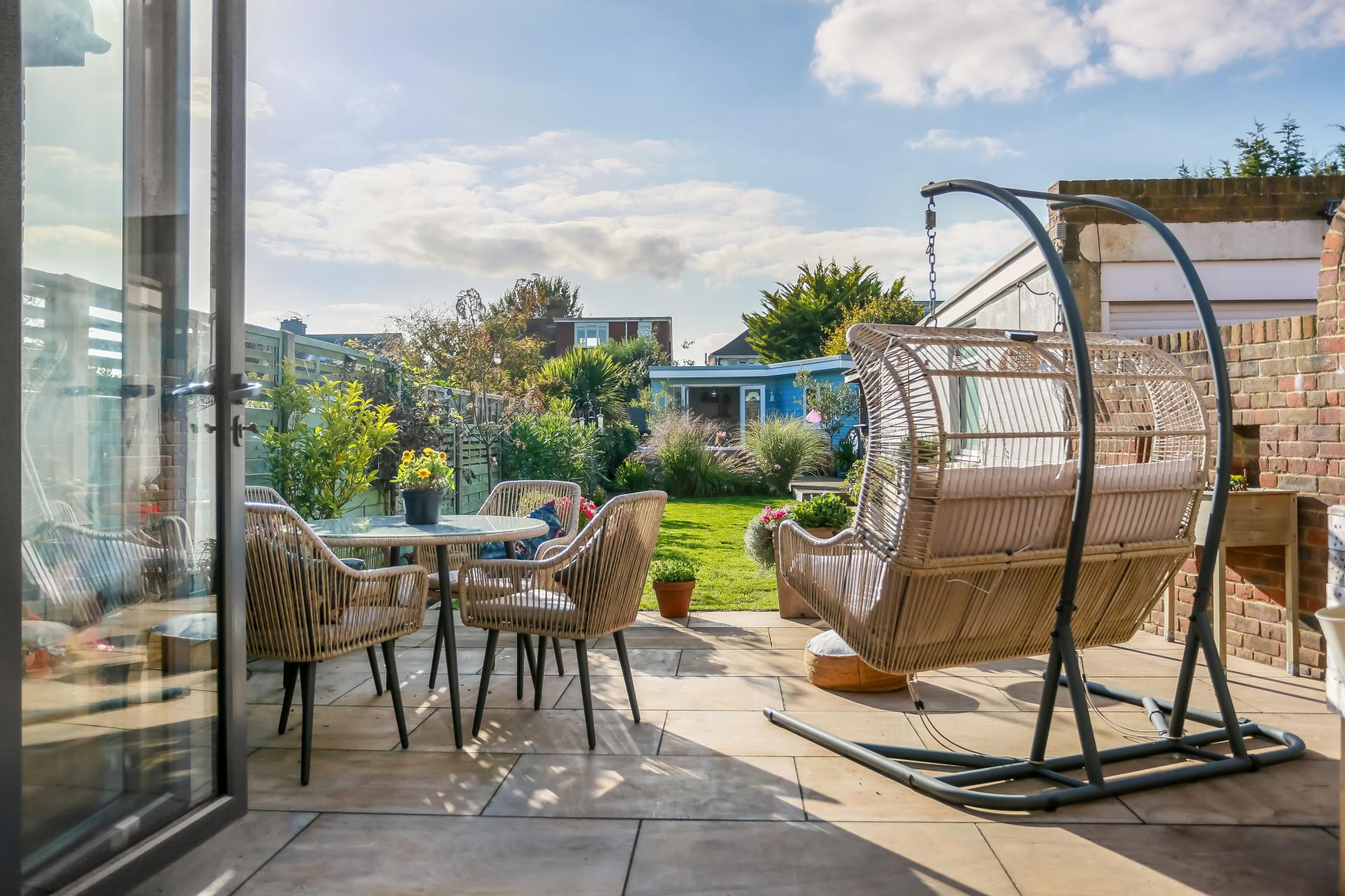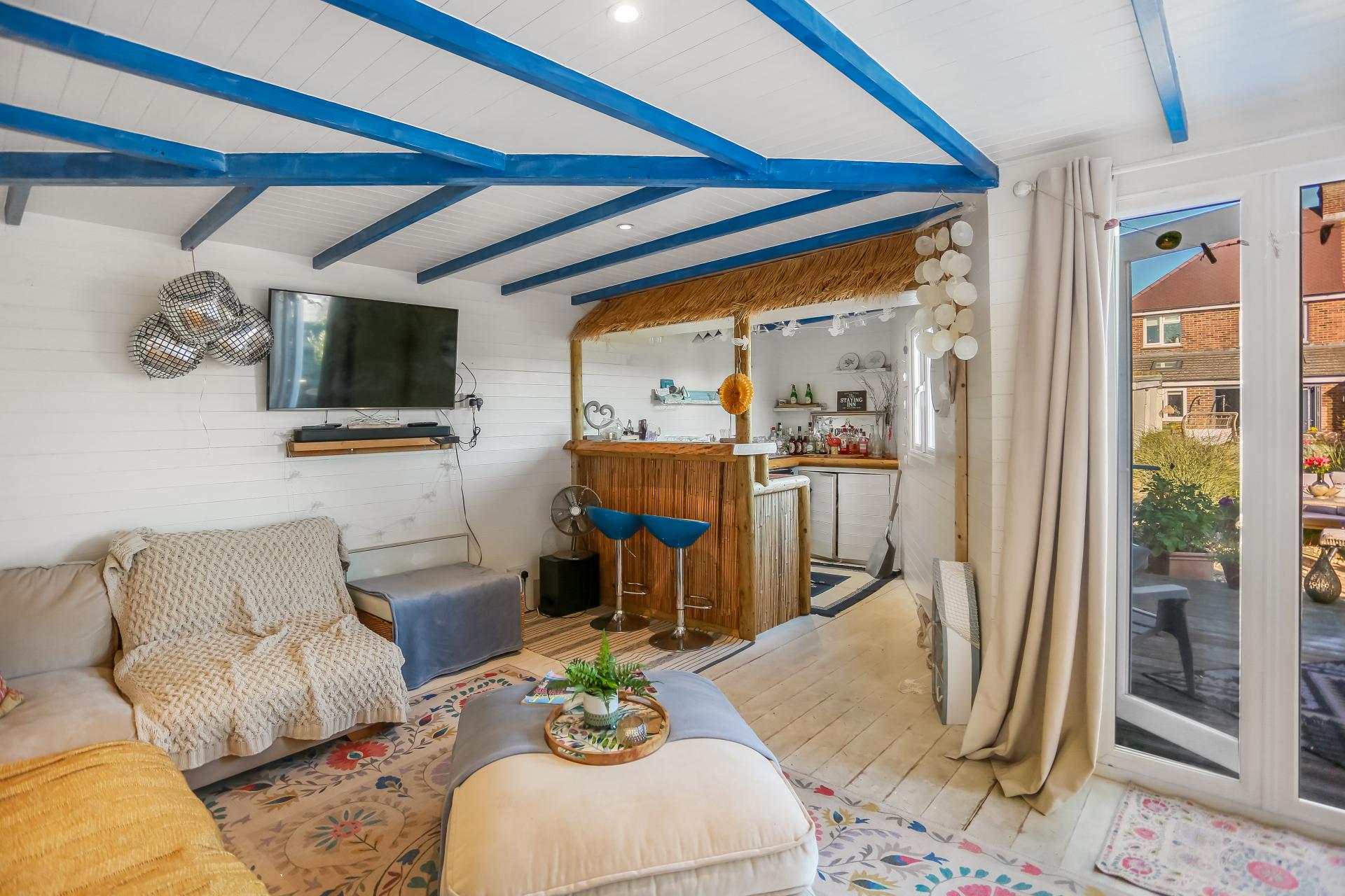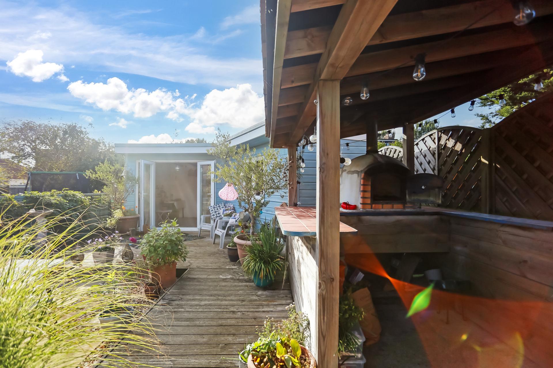 This wonderful home boasts a large, impeccably kept west-facing garden with a sizable lawn and a patio area. The garden enjoys a sheltered area currently housing a pizza oven, a spacious fully-powered summer house and decked area. Whilst the space is well-suited for entertaining, it could be easily adapted to accommodate a work from home space or gym. There is the added benefit of a sizable garage and store room.
