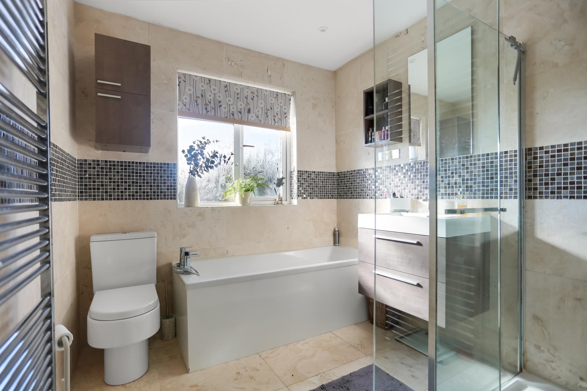Upstairs, there are a further three bedrooms with the two largest having the added benefit of built-in wardrobes. There is a contemporary bathroom suite with separate bathtub and walk-in shower.