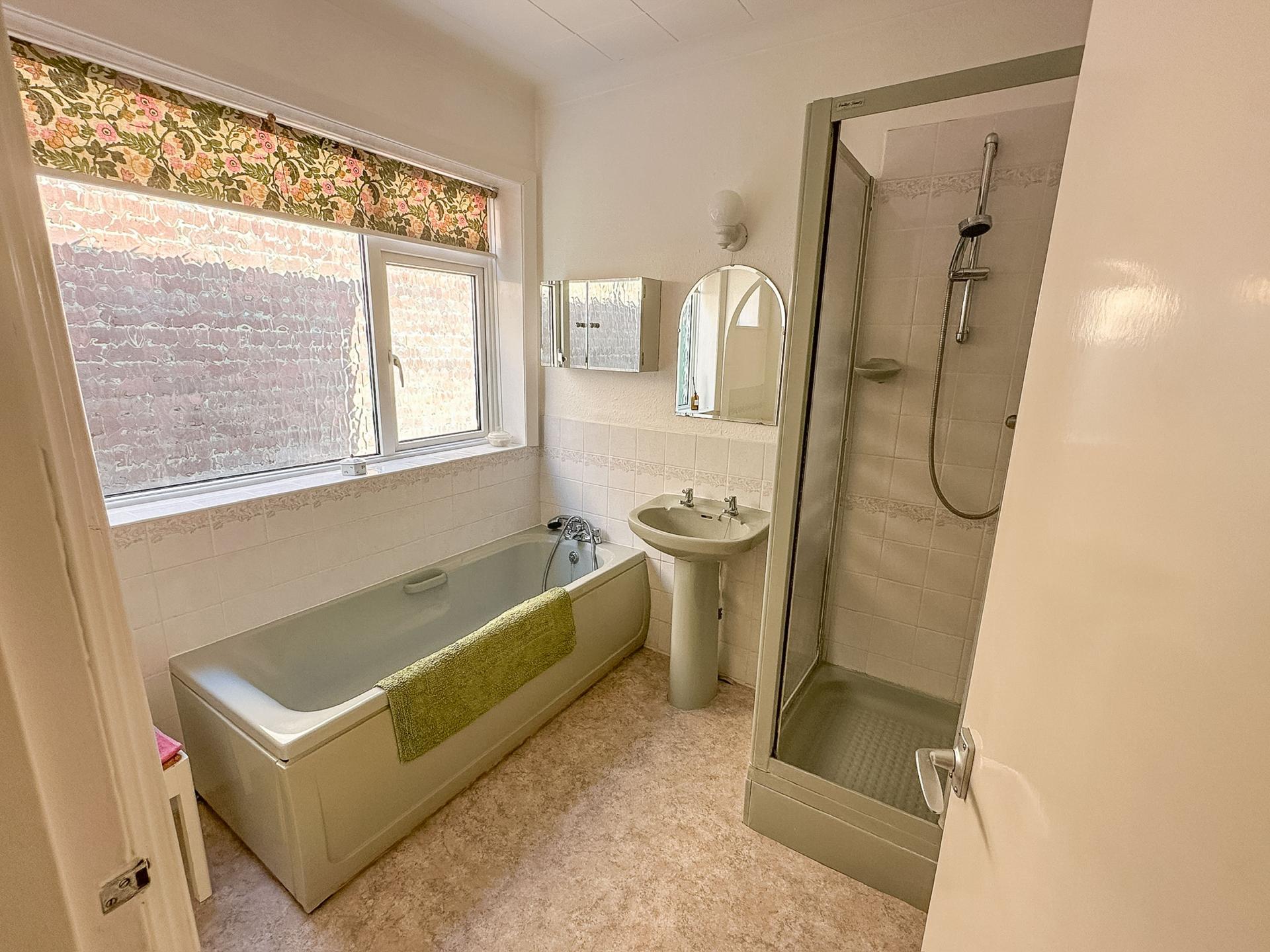 BATHROOM Coloured suite comprising; panelled bath with mixer tap and shower attachment, pedestal wash hand basin, close coupled w.c., large double glazed window to side aspect and smaller window to one side, corner shower cubicle with panelled door, double radiator.