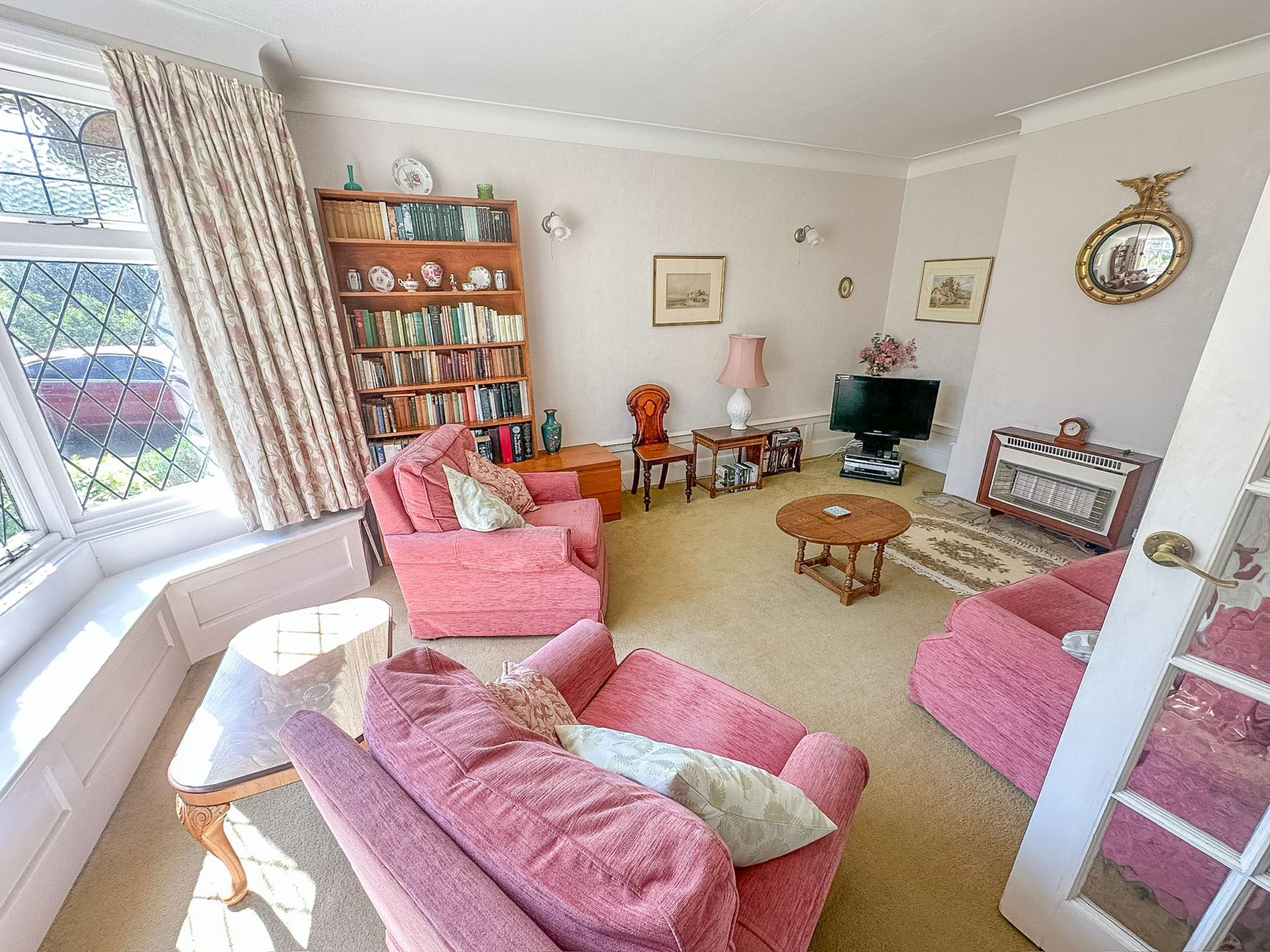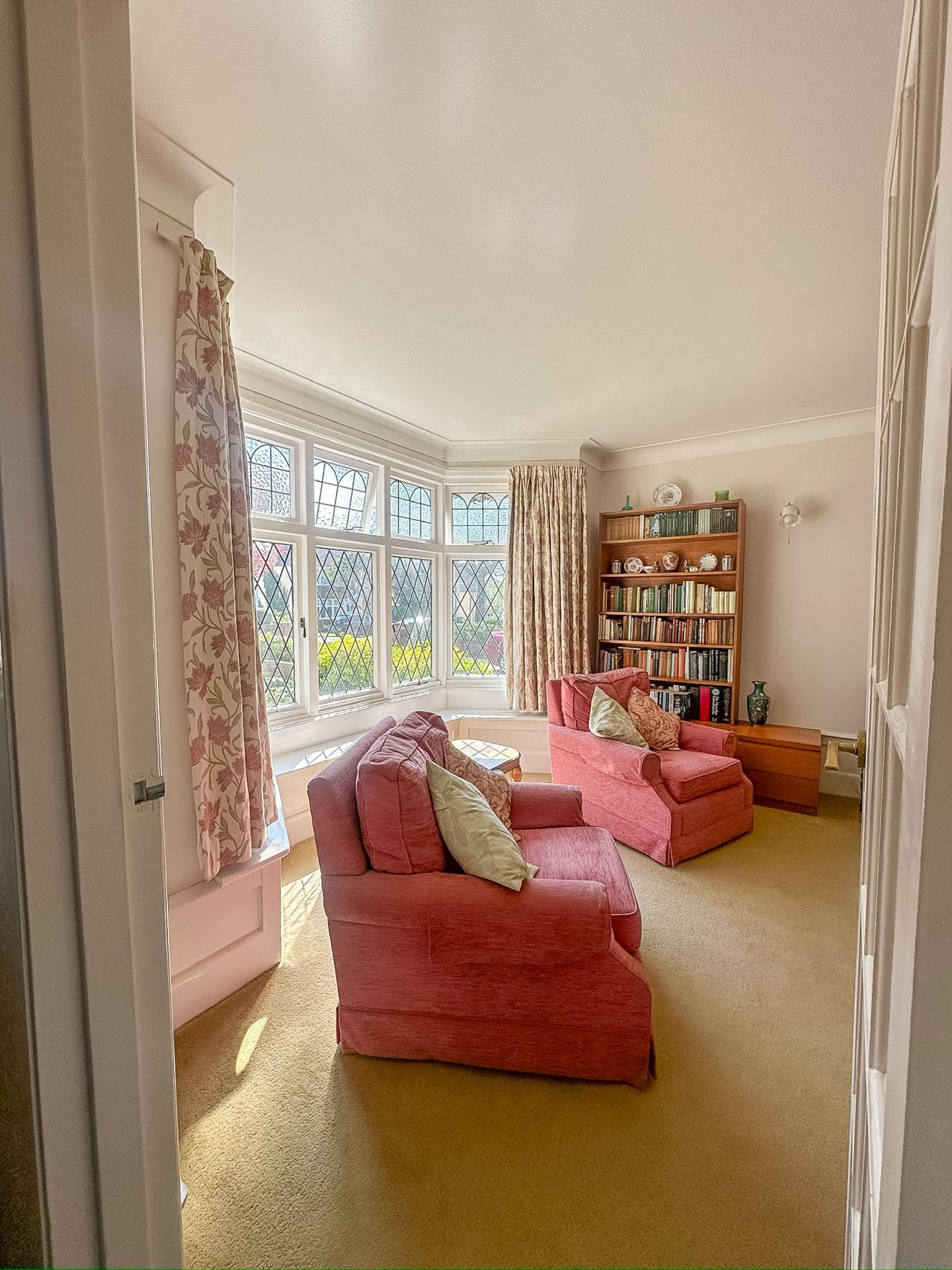 BEDROOM 1 18' 0" into bay window x 12' 10" (5.49m x 3.91m) Double glazed leadlight window to front aspect, double radiator, infinity ceiling, central chimney breast with built-in wardrobe to one side.