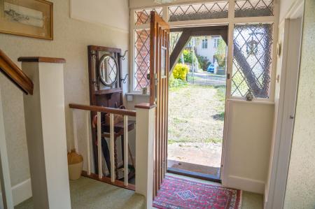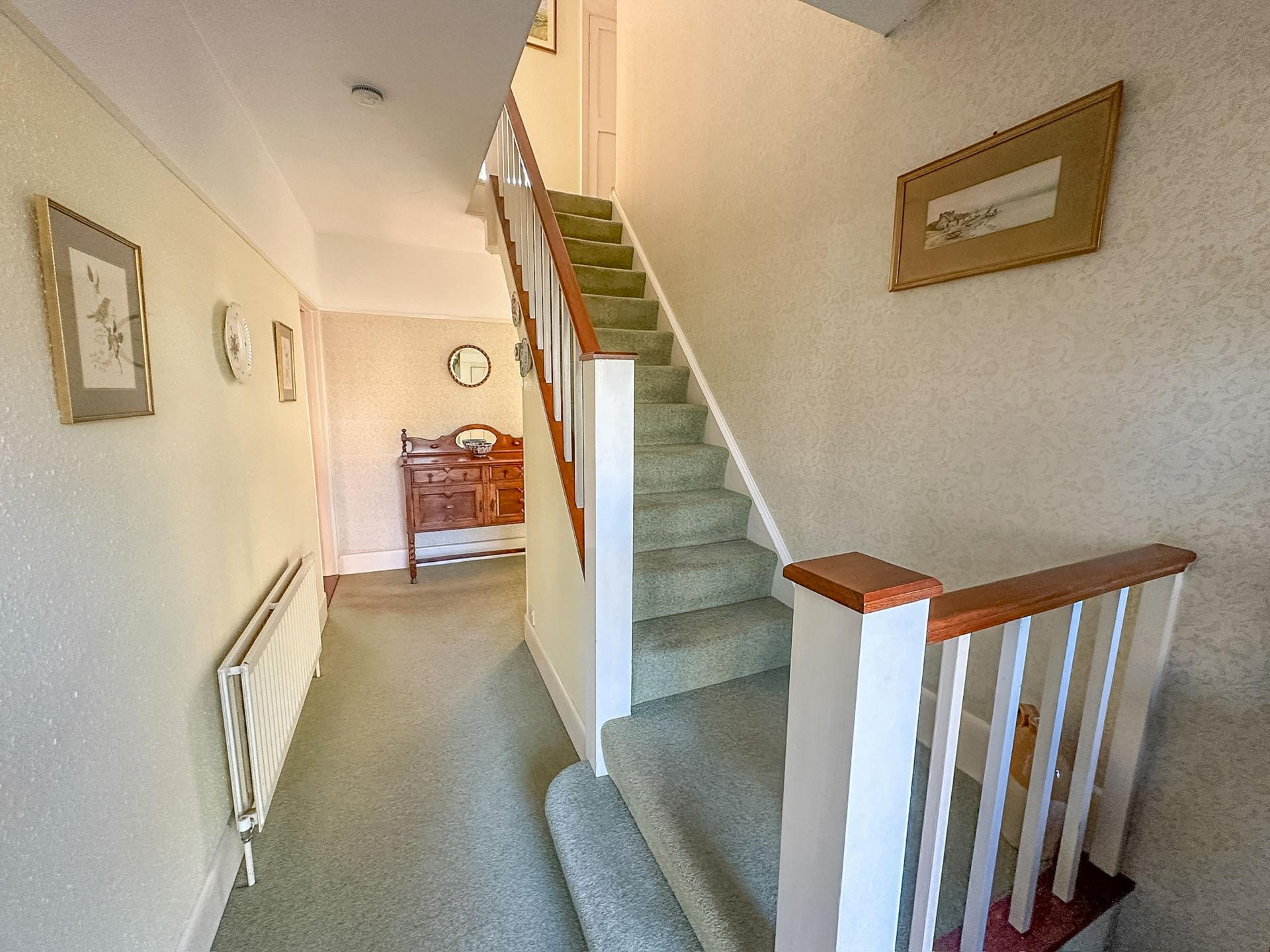 HALLWAY Balustrade staircase rising to first floor with understairs storage cupboard housing gas and electric meters, central heating control switch, ceiling coving, doors to primary rooms, radiator.