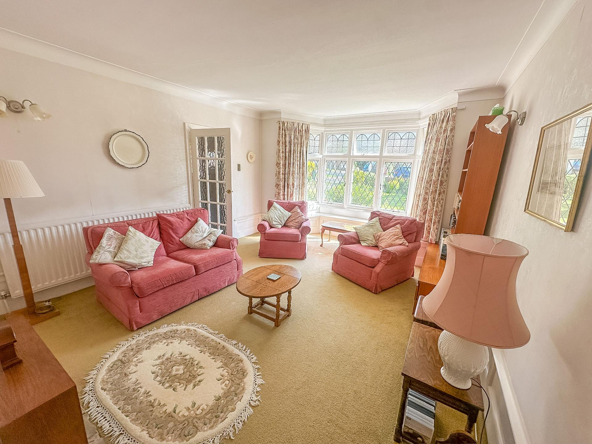 LOUNGE 18' 0" into bay window x 12' 10" (5.49m x 3.91m) Bay window with leadlight panels overlooking garden, low level panelling under window and to walls, central chimney breast with gas fire (not tested) and paved hearth, built-in dresser unit to one side with cupboards under, double radiator, ceiling coving.