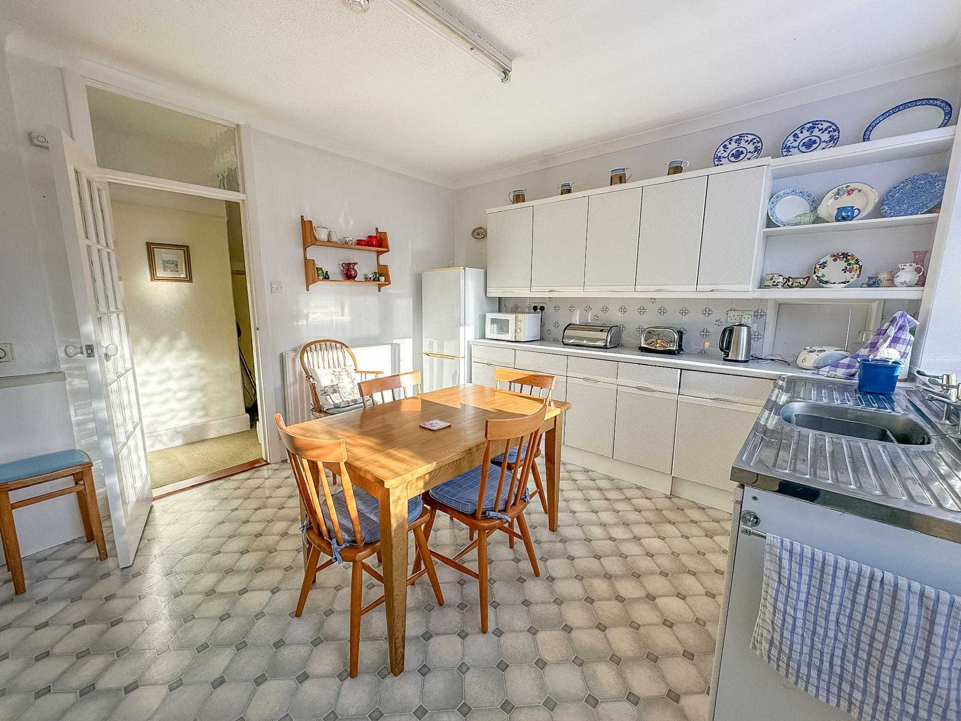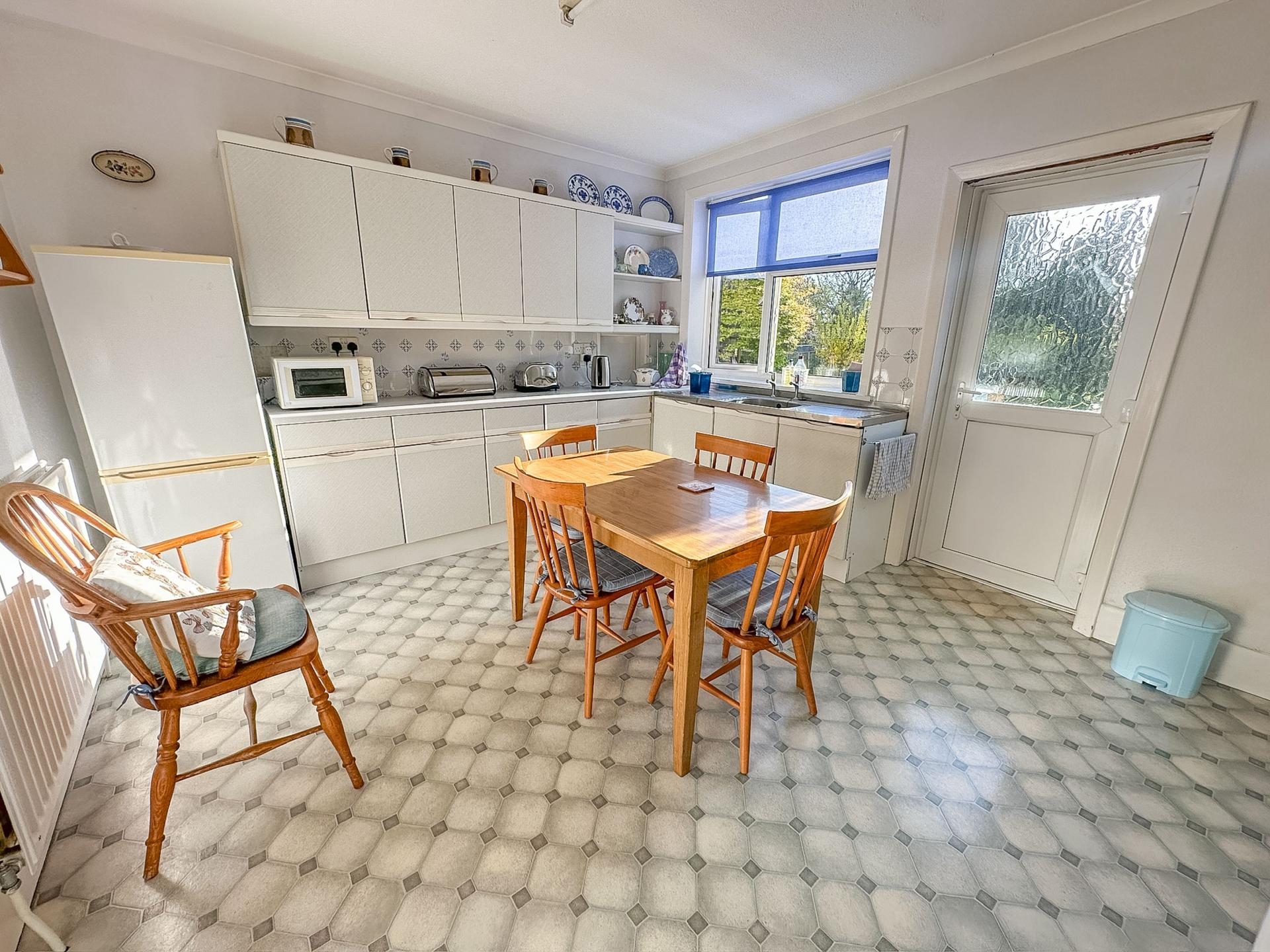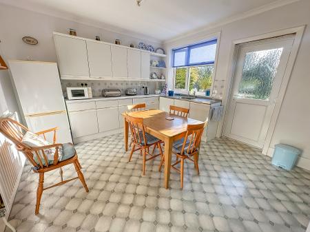 KITCHEN/BREAKFAST ROOM 14' 3" x 11' 8" (4.34m x 3.56m) Range of matching wall and floor units with roll top work surface, gas cooker point, free standing Worcester boiler supplying domestic hot water and central heating (not tested), ceramic tiled surrounds, washing machine point, double glazed window to side aspect, double glazed door leading to rear garden with window to one side, double drainer sink unit, serving hatch to dining room, range of drawer units, space for free standing fridge/freezer, double radiator, glazed panelled door to hallway.