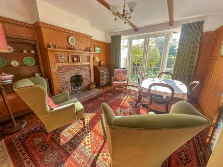 DINING / SITTING ROOM 15' 6" x 12' 9" (4.72m x 3.89m) Lincrusta style panelling to walls with plate rack over, serving hatch to kitchen, twin double-glazed doors with full height windows to either side leading to rear garden, central carpet with parquet wood flooring surround, brickette surround fireplace with matching hearth and wooden mantle over, double radiator, glazed panelled door to hallway.