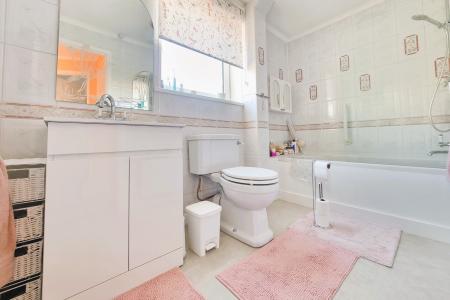 LARGE FAMILY BATHROOM 10' 0" x 5' 6" (3.05m x 1.68m) White suite comprising; panelled bath with mixer tap and separate shower over with folding screen, fully ceramic tiled to walls, vinyl flooring, mirror fronted medicine cabinet, low level w.c., wash hand basin with mixer tap and cupboards under, double glazed frosted window to side aspect, radiator.