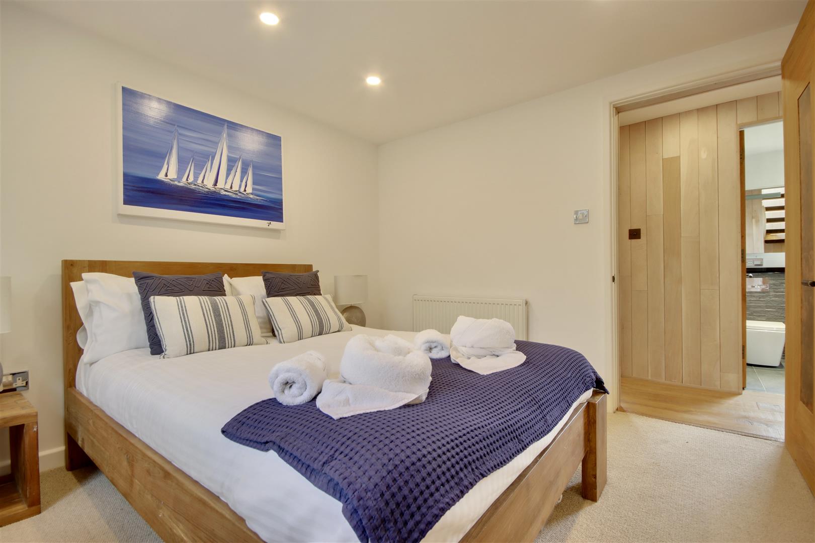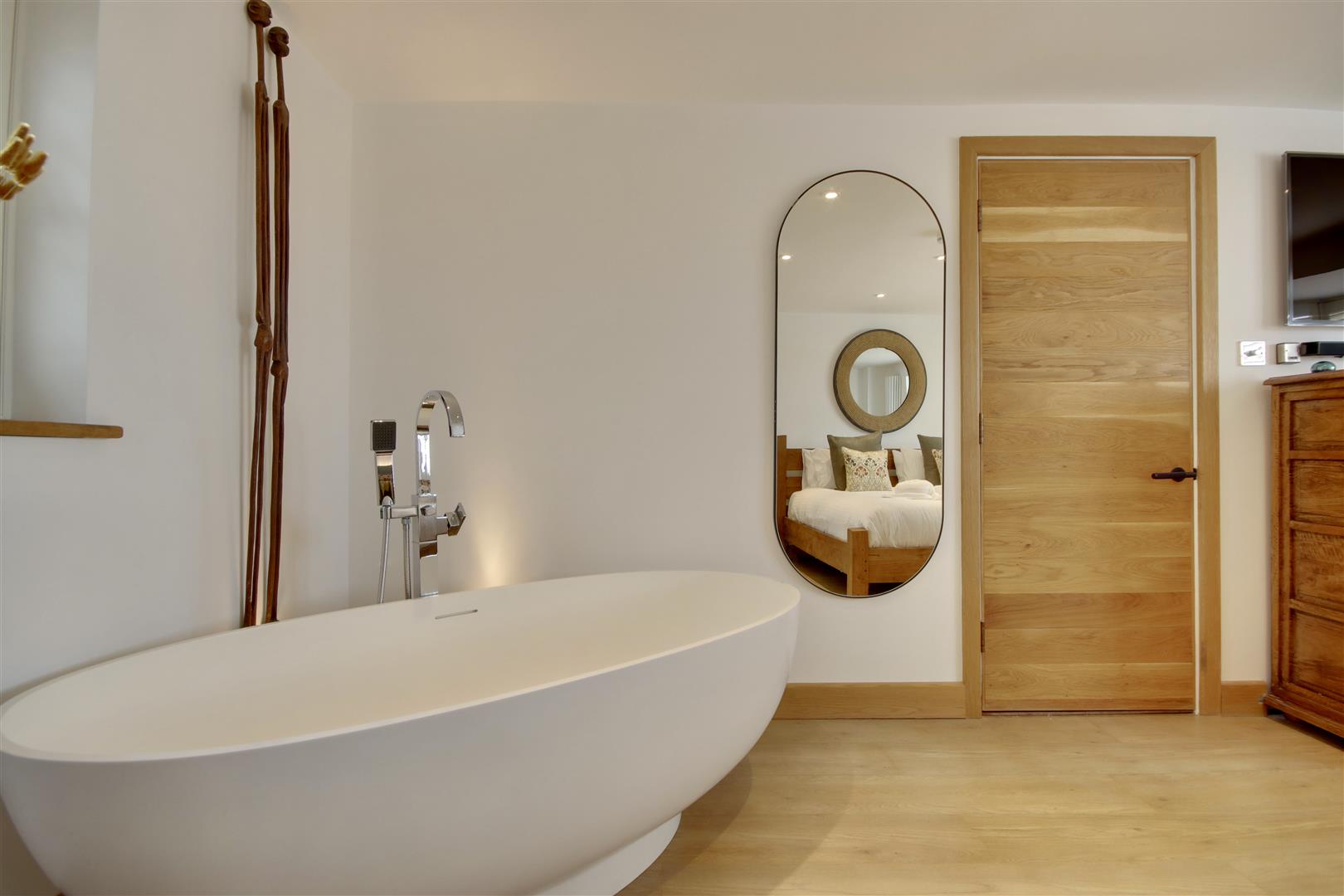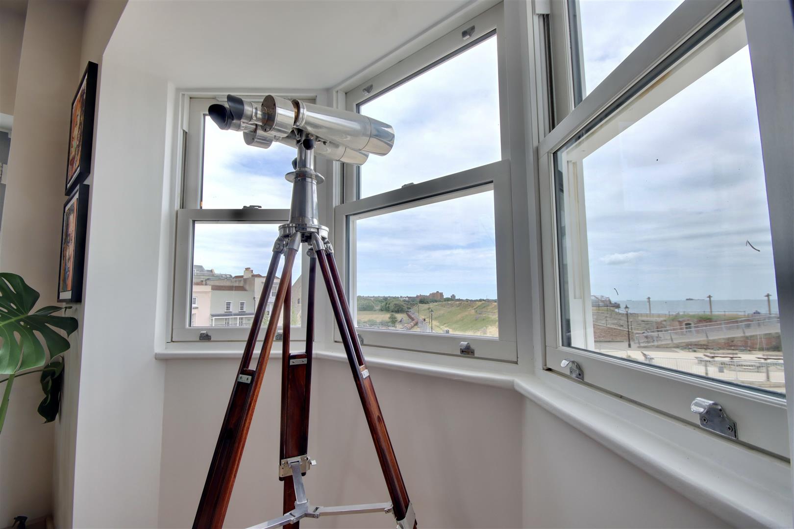 The heart of the home is undoubtedly the open-plan top floor, which boasts a bespoke, hand made kitchen, from which you can breathtaking sea views that can also be enjoyed living areas and balcony. This space is ideal for entertaining guests or simply relaxing while soaking in the stunning vistas of the coastline. The master suite is a true sanctuary, featuring a luxurious free-standing bathtub that invites you to unwind after a long day. Adding a further touch of luxury, the ground floor sees a large home-gymnasium and conservatory, offering flexibility to an already versatile home.