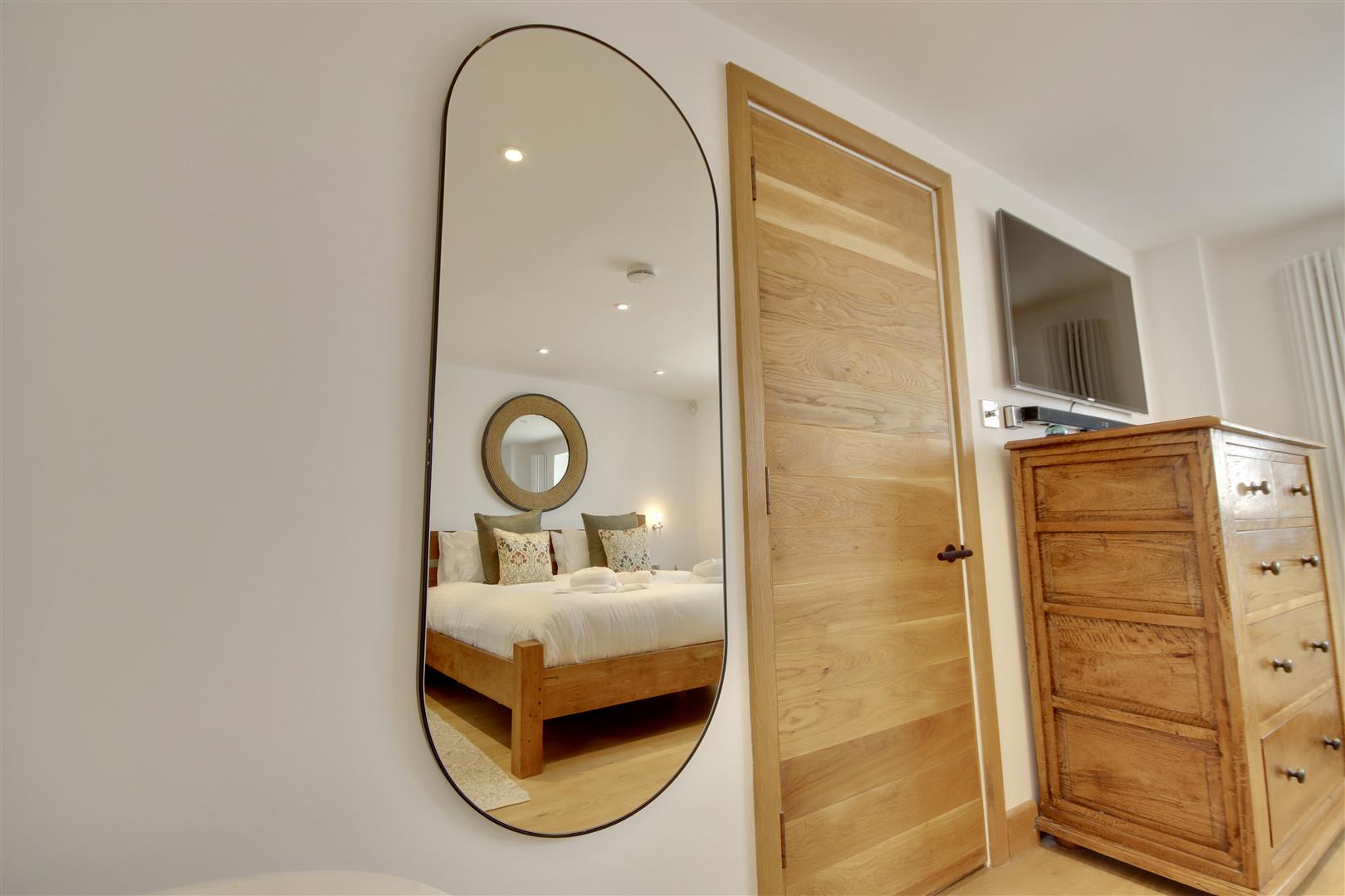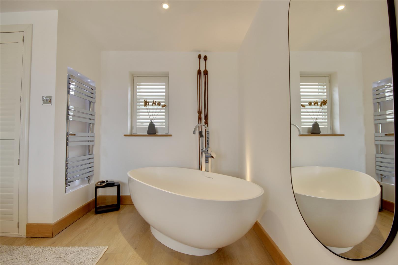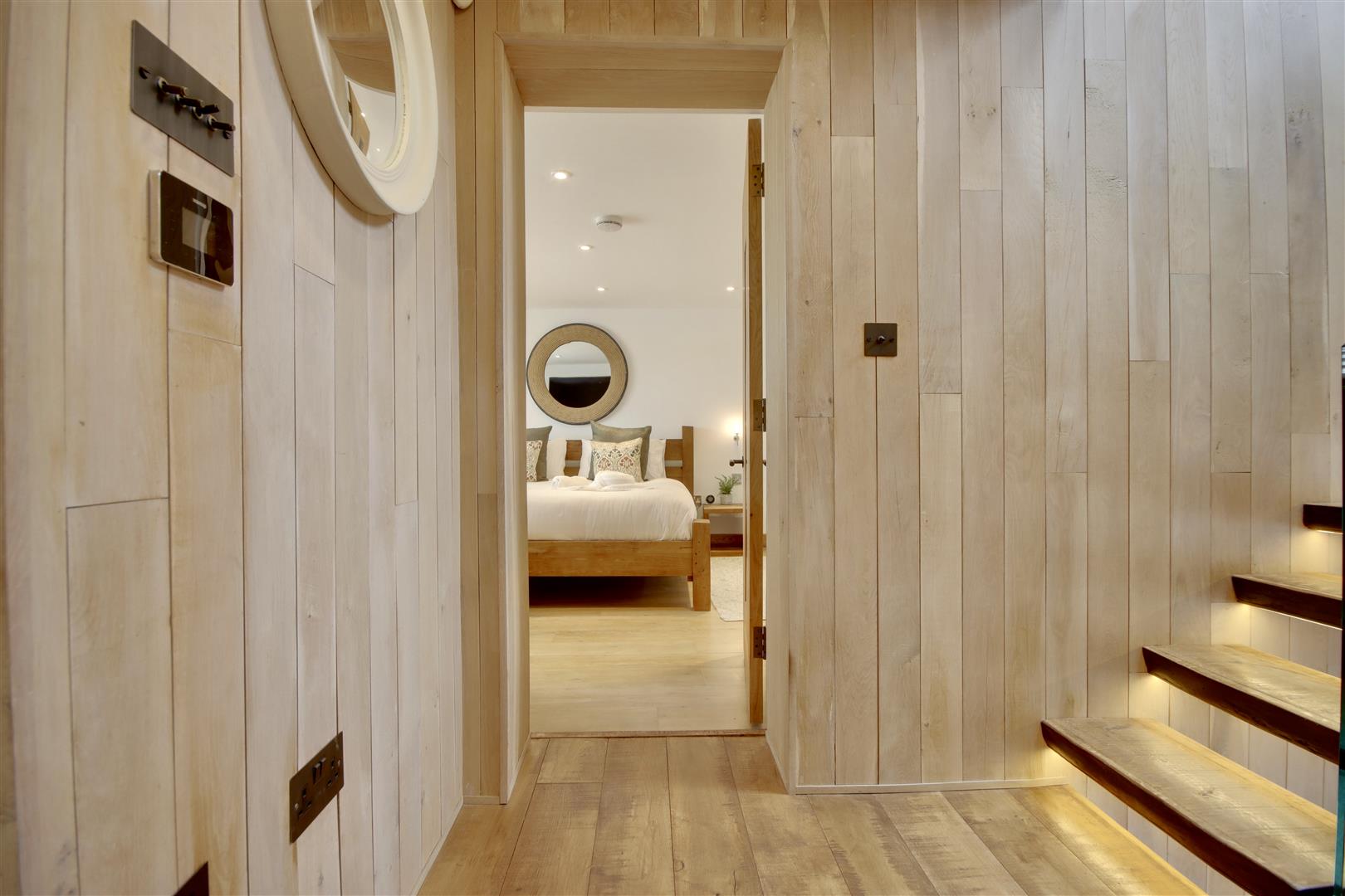 The heart of the home is undoubtedly the open-plan top floor, which boasts a bespoke, hand made kitchen, from which you can breathtaking sea views that can also be enjoyed living areas and balcony. This space is ideal for entertaining guests or simply relaxing while soaking in the stunning vistas of the coastline. The master suite is a true sanctuary, featuring a luxurious free-standing bathtub that invites you to unwind after a long day. Adding a further touch of luxury, the ground floor sees a large home-gymnasium and conservatory, offering flexibility to an already versatile home.