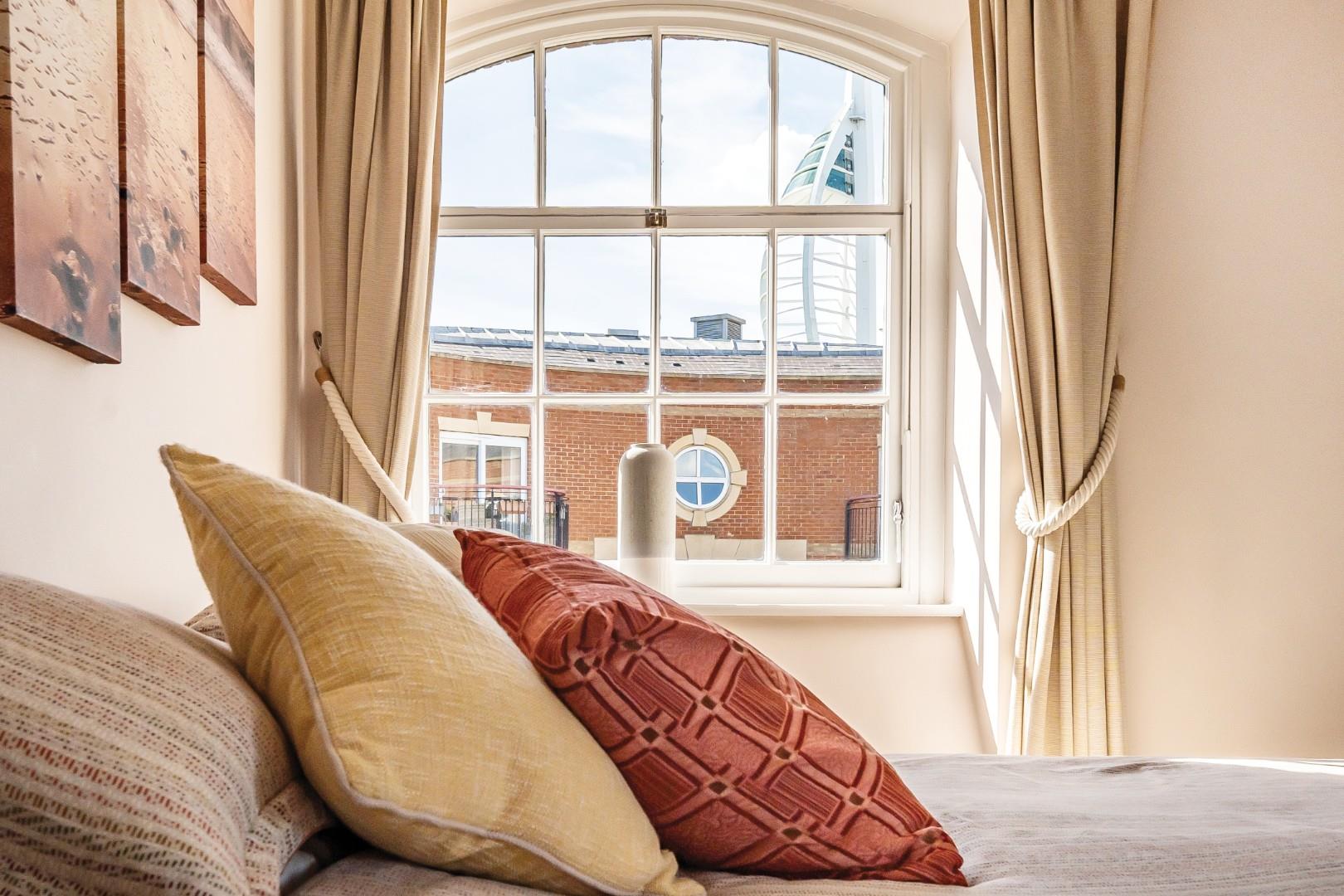 The first floor consists of two double bedrooms, both equipped with built in storage and arched windows flooding with natural light. A good sized kitchen separates the bedrooms from a simply beautiful living room with duel aspect windows, offering an abundance of space for both dining and lounging. Past the first first floor shower room and moving upstairs, you will find another bathroom and third bedroom, boasting outstanding views of the Spinnaker Tower and the harbour.
