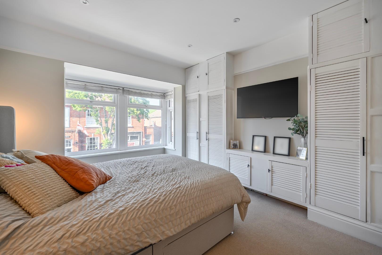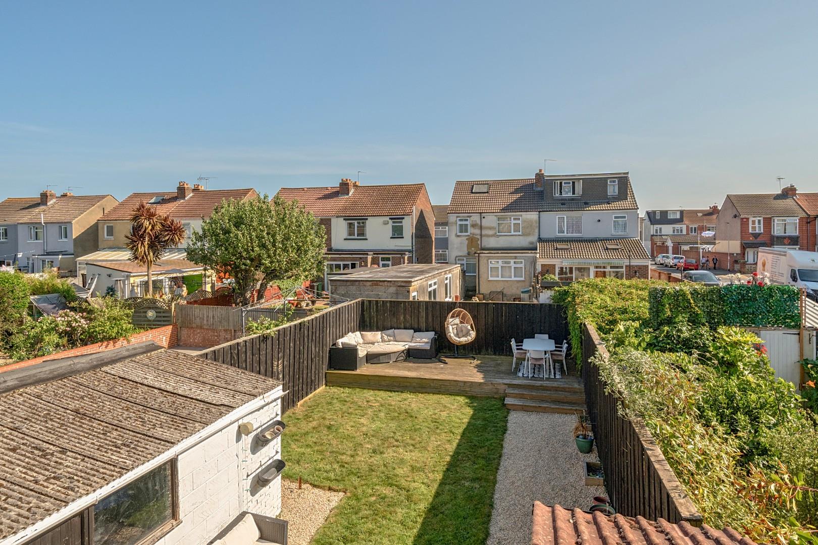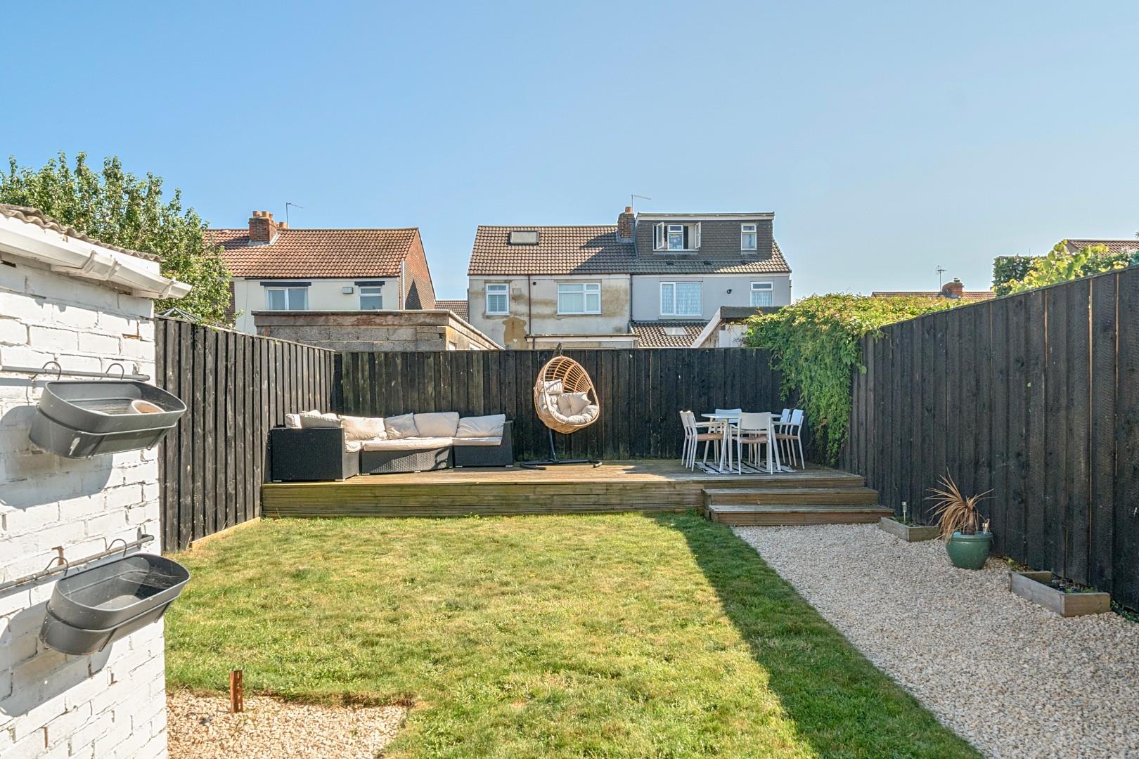 The south-facing garden is a true highlight, featuring a well-maintained lawn and raised decking at the bottom, creating a perfect spot for outdoor relaxation or al fresco dining.