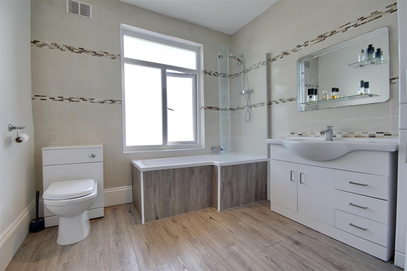 Upstairs, you will find three generously sized double bedrooms, each fitted with stylish shutters, ensuring privacy and light control. The family bathroom is well-appointed, providing a comfortable space for daily routines.