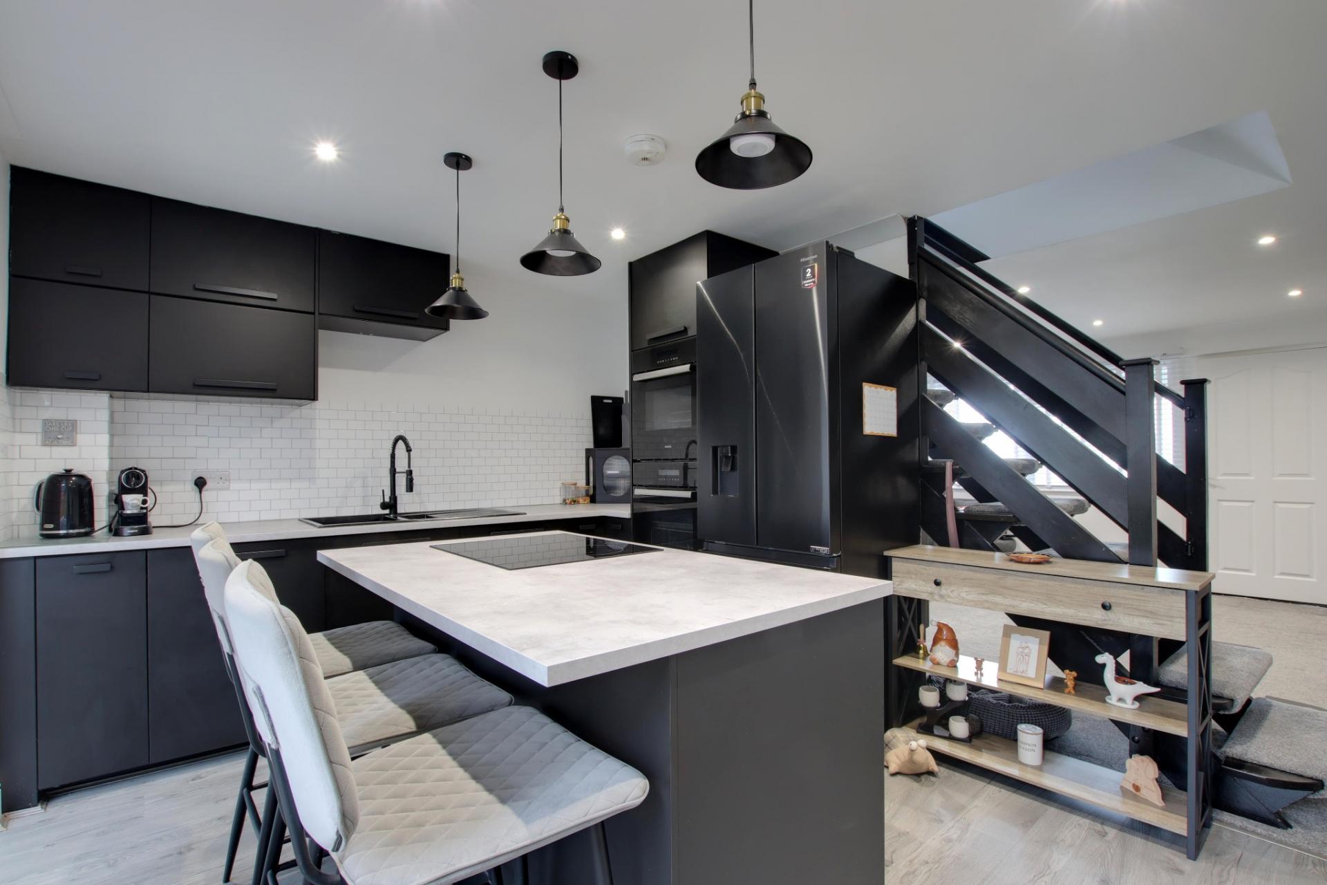 Double glazed French doors leading to the rear garden. Double glazed windows to the rear and side aspect. Smooth and coved ceiling with inset spotlighting. Matching wall and base matt units with contrasting work tops. Inset sink and half drainer. Two fitted ovens. Integrated dishwasher. Space for fridge/freezer, washing machine and tumble dryer. Island with a four ring induction hob. Breakfast bar and drawers beneath. Modern tall radiator. Wood effect flooring.