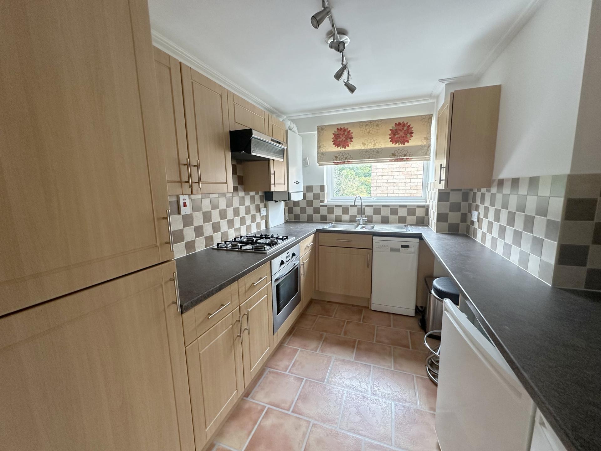 Double glazed window, range of wall and base units, 4 ring gas hob with electric oven below and extractor above. 1½ bowl stainless steel sink unit with drainer and mixer tap, half dishwasher, under counter fridge and separate freezer. Tiled splash backs and tiled effect flooring. Coved ceiling, track spot light and power points. Wall mounted Baxi combination boiler and radiator.