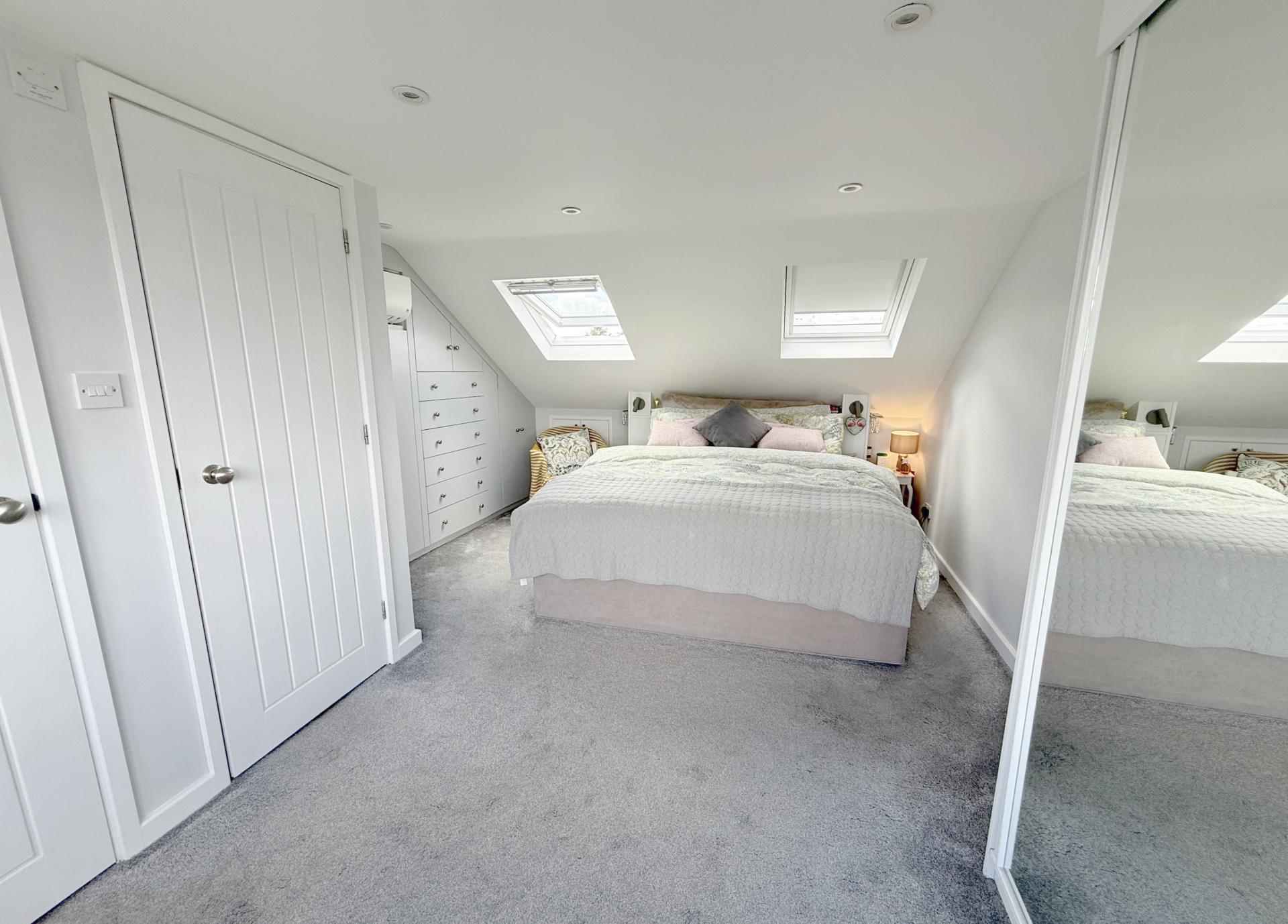 Double glazed window to rear, two velux roof windows to front, fitted wardrobes to one wall plus further built in storage, access to eaves loft space, dual purpose wall mounted air conditioning/heating unit, door to en-suite shower room.