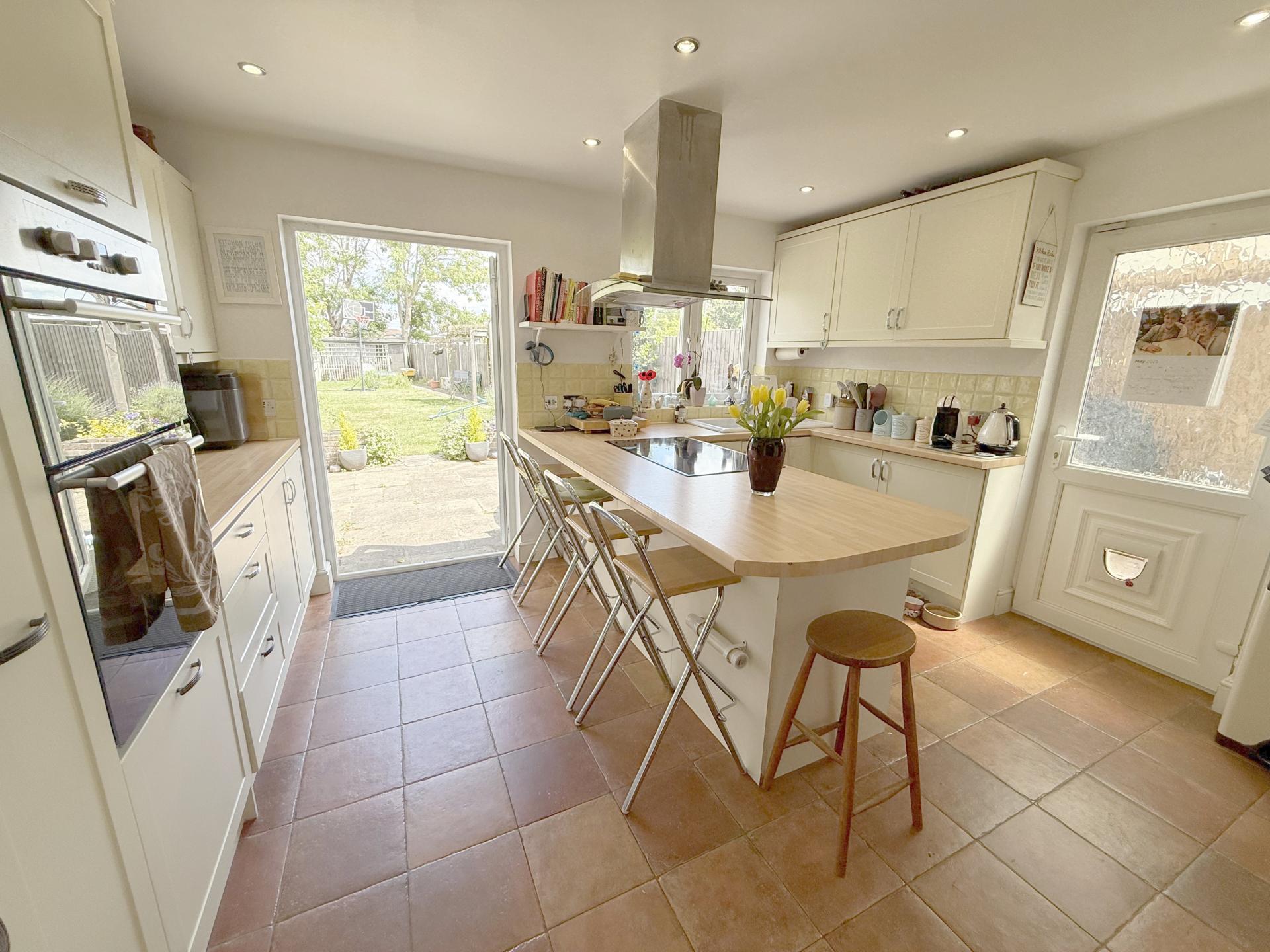 Double glazed window to rear overlooking garden, double glazed door to side, double glazed french doors to rear leading out to patio, recessed spotlighting, worksurfaces with a range of matching wall, base & drawer units, 5 ring electric hob with chimney style cooker hood above, built in electric oven and grill, integrated dishwasher, integrated fridge/freezer, 1 1/2 bowl ceramic sink unit with mixer taps and drainer, part tiled walls, breakfast bar, tiled floor with underfloor heating, door to utility room.