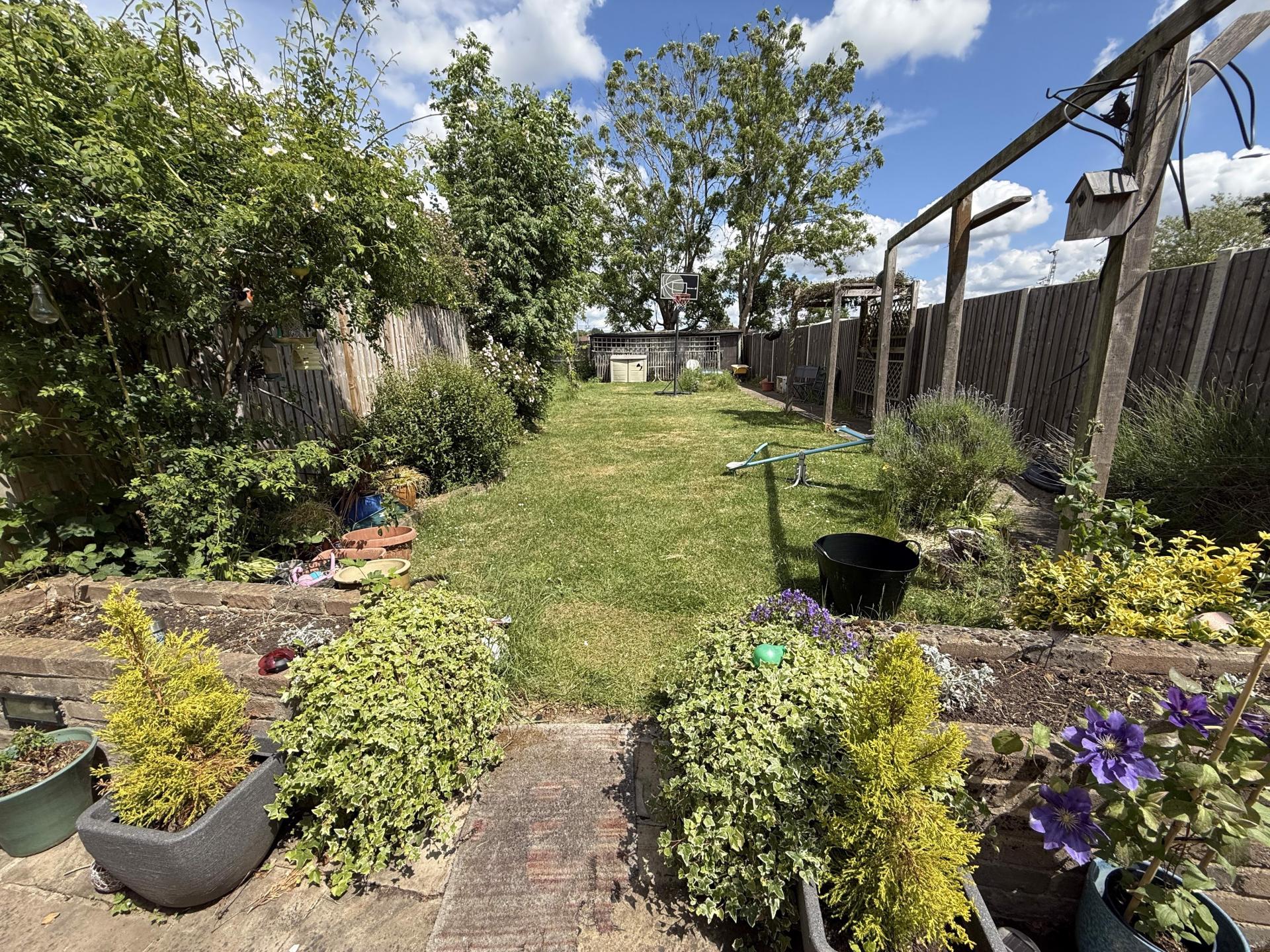 Patio area to rear of property, raised flower beds bordering main lawn area, range of mature shrubs and trees, outside tap, outside lighting, large shed to rear of garden, side passage with gated side access to front of property.