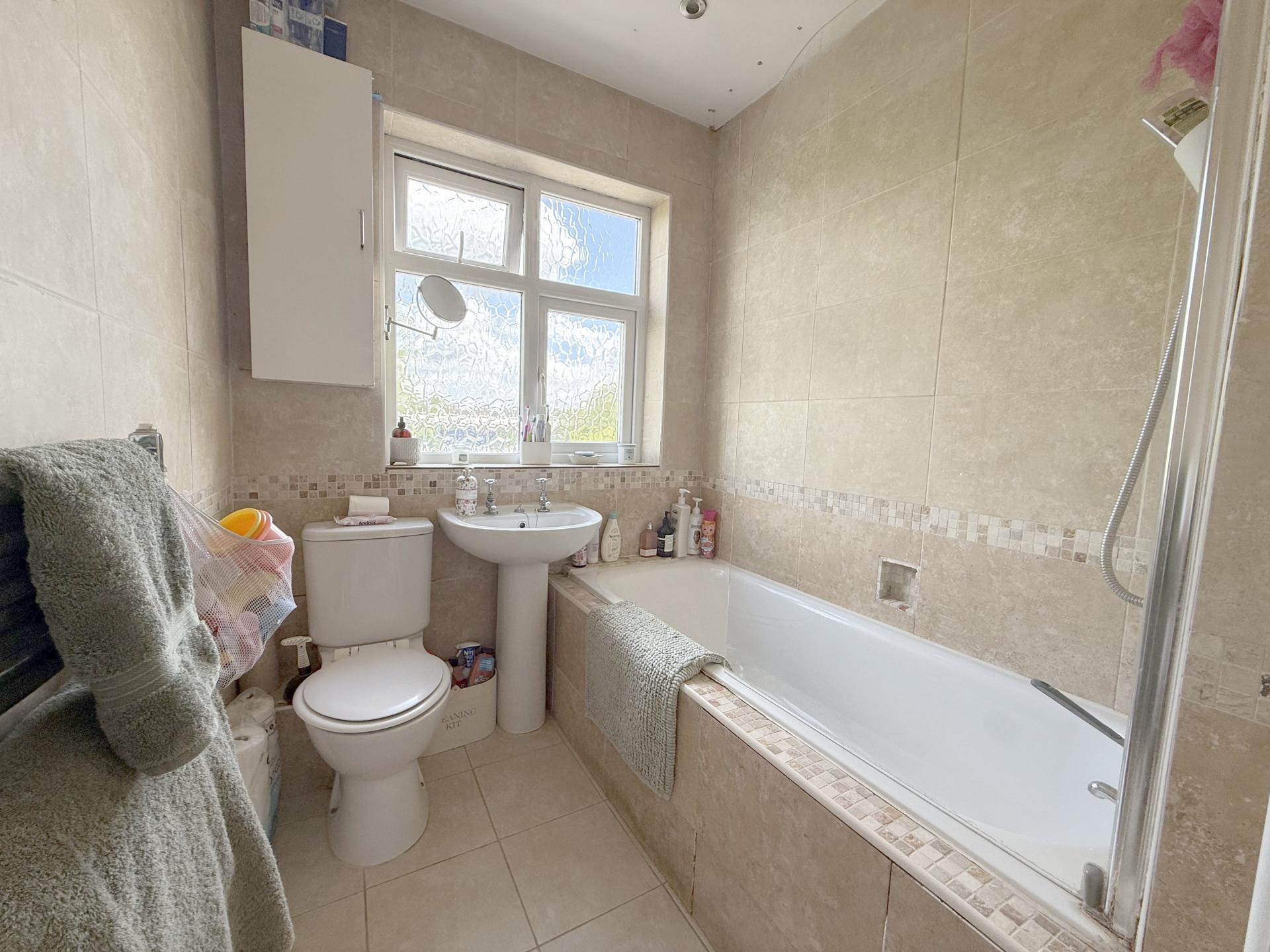 Double glazed window to rear, recessed spotlighting, fully tiled walls, low level w.c, pedestal wash hand basin, tiled enclosed bath with mixer taps and independent shower over, glass shower screen. heated towel rail, tiled floor.