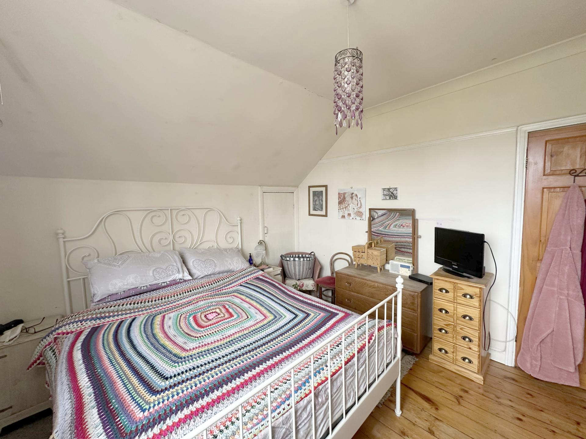 Double glazed window to the rear, exposed wood floorboards, door into the side loft storage. power points, radiator.