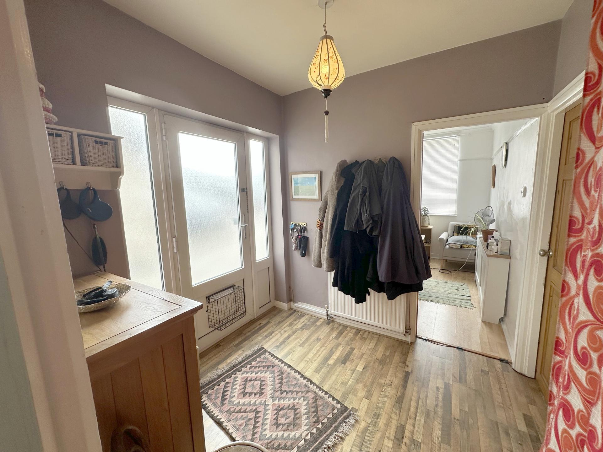Upvc entrance door with side double glazed windows, wood flooring, radiator, doors leading to various rooms and stair ascending to the first floor.