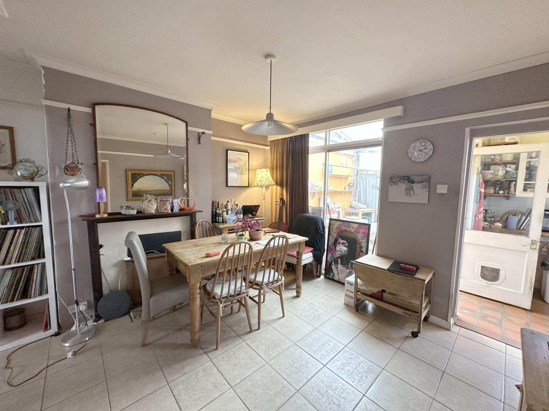 Double glazed window to the rear looking into the lean to. Tiled flooring, Open fireplace (not used), coved ceiling, power points, cupboard under stairs, door to kitchen.
