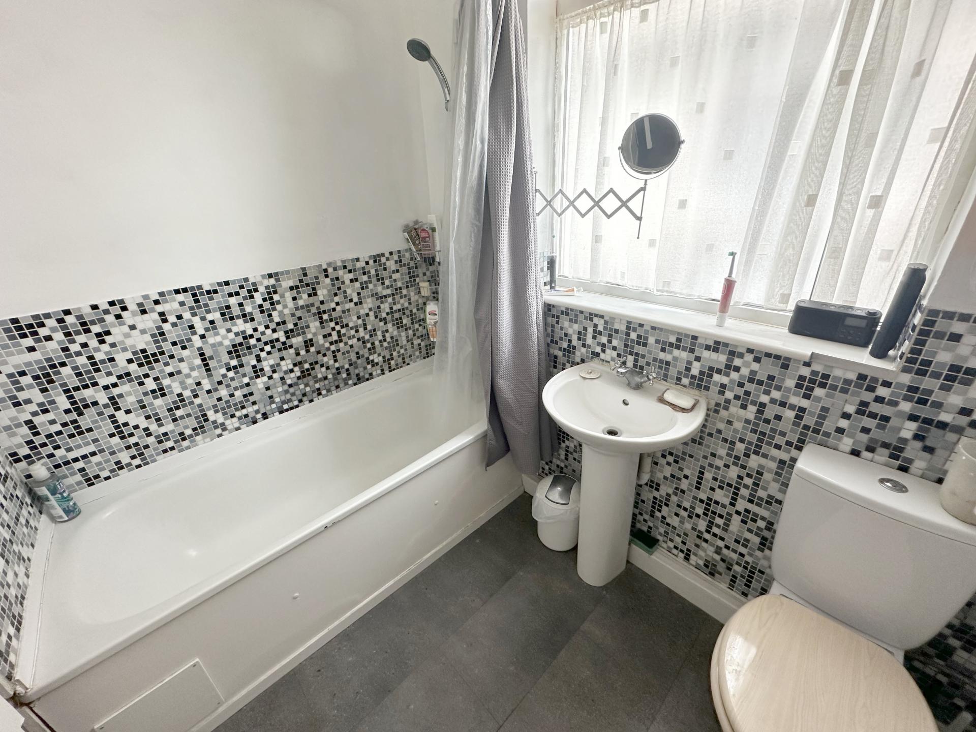 Double frosted glazed window to the side. Panelled bath with mixer tap and shower attachment. Pedestal hand basin with mono bloc tap, Low level W.C; covered radiator, tiled splash backs , tiled flooring, cupboard housing the hot water tank, wall mounted storage cupboards