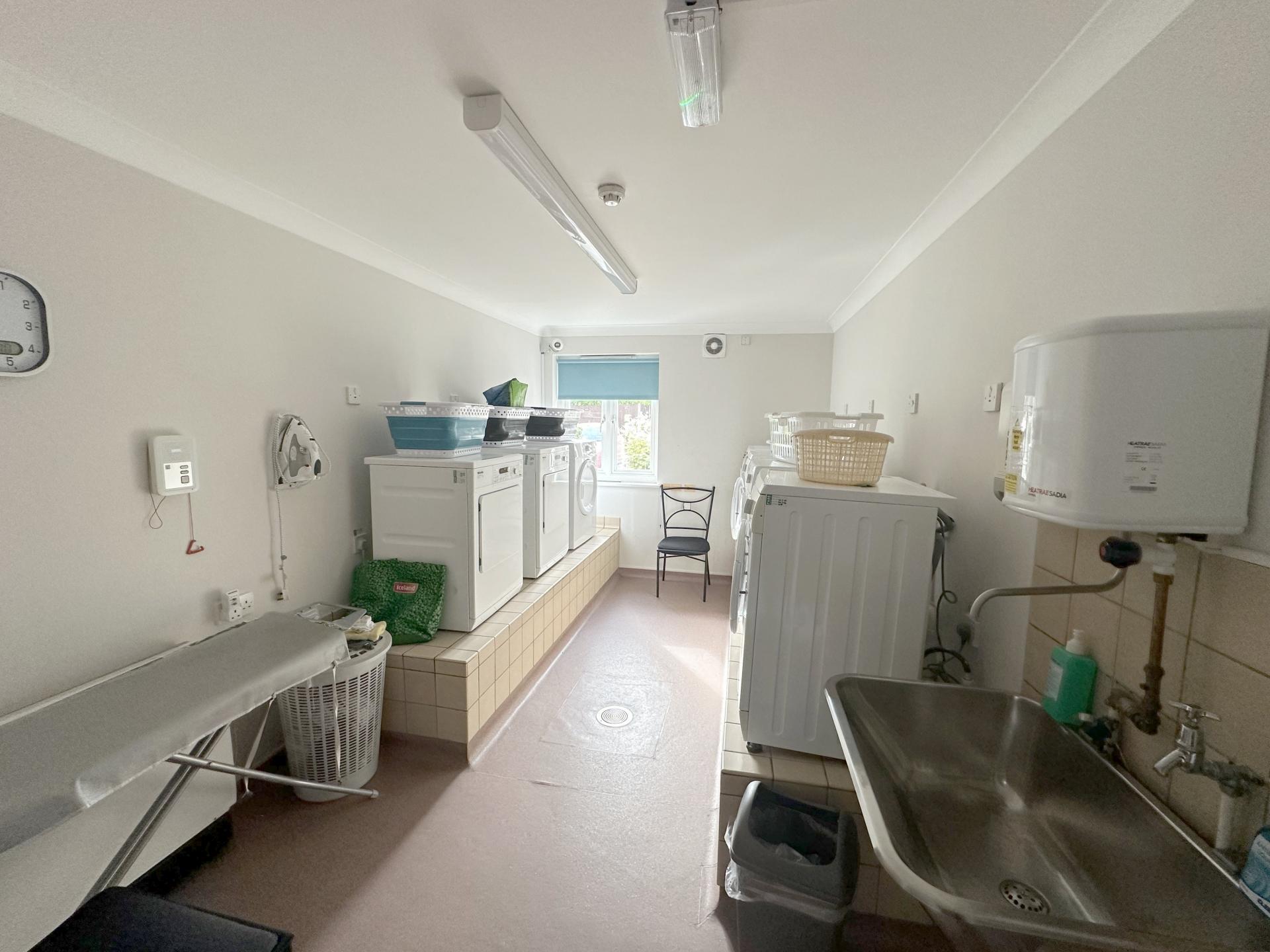 Residents lounge with a kitchenette providing tea and coffee making facilities, fridge, microwave & dishwasher. Windows and doors to rear leading out to the garden with Patio areas to both the rear and to the front. There is a guest cloakroom just off the resident's lounge and an overnight guest suite with twin beds, shower room, television and tea/coffee making facilities. The Laundry room consists of washing machines & tumble dryers and is inclusive for residents. Refuse Bin area sited on the ground floor.