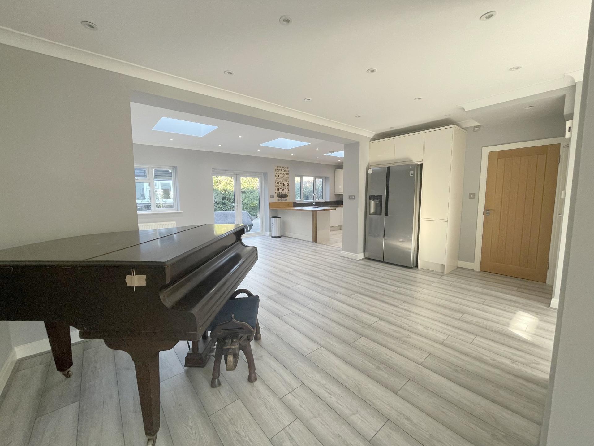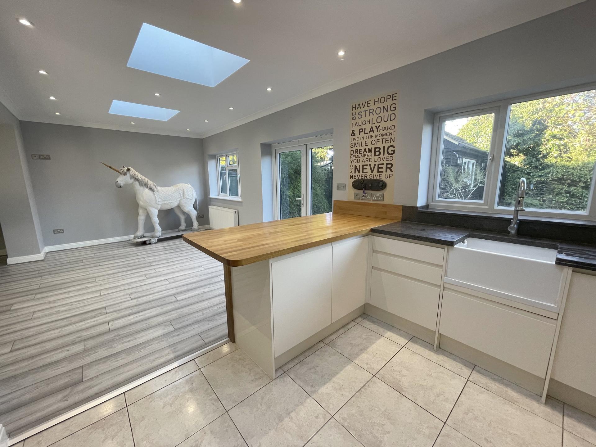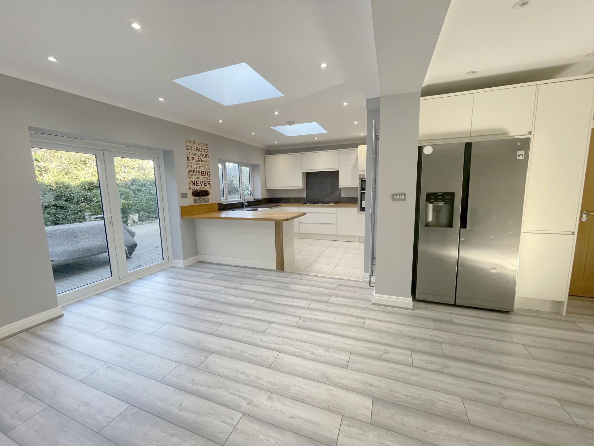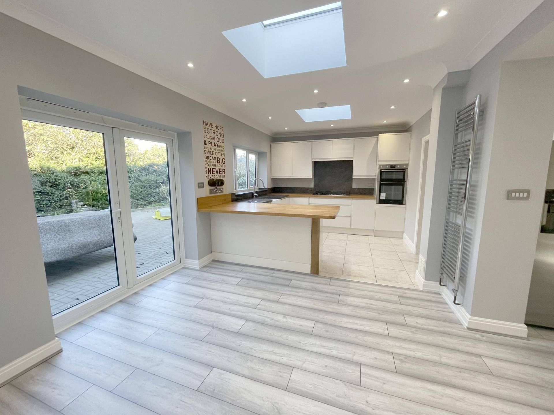 Dining area: double glazed to rear, double glazed french doors to rear leading out to garden, coved ceiling, recessed spotlighting, two roof lights, double radiator, wood flooring. Kitchen area: Double glazed window to rear, coved ceiling, recessed spotlighting, wooden worktops with a range of matching wall, base & drawer units, 5 ring gas hob with granite backsplash, built in electric oven/grill, integrated dishwasher, butler sink with granite surface/drainer & matching upstands, tiled flooring, heated towel rail, roof light, door to utility room.