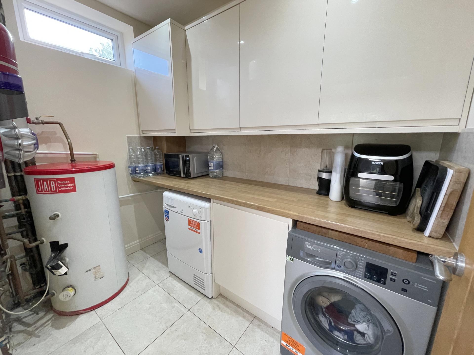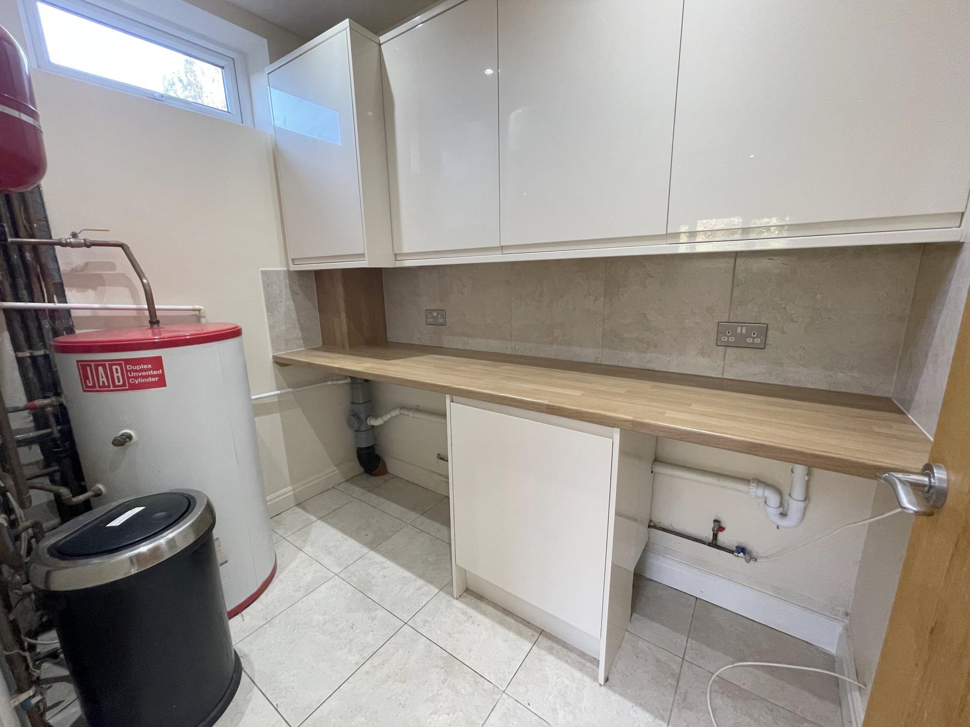 Double glazed window to side, worktop with a range of matching wall & base units, part tiled walls, space & plumbing for washing machine & dryer, wall mounted boiler, JAB pressurised hot water cylinder, tiled flooring.