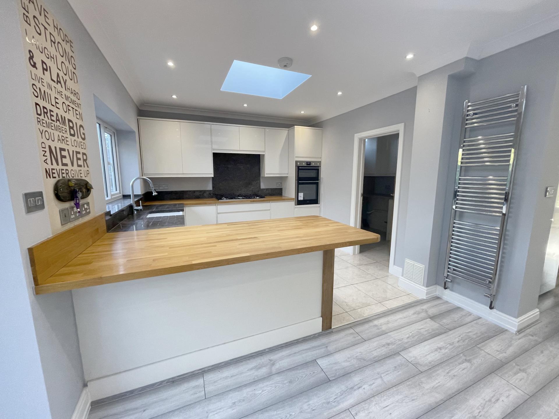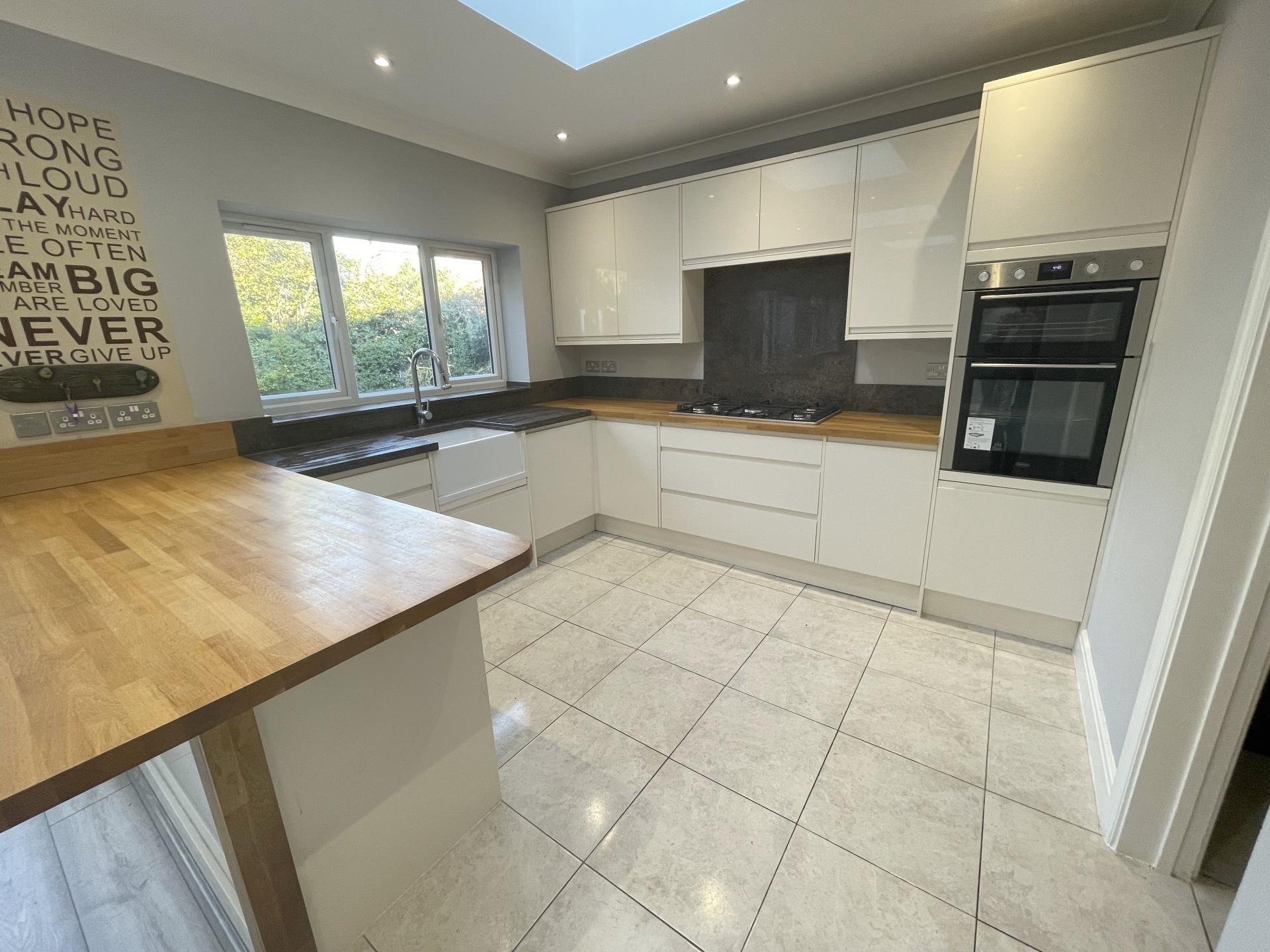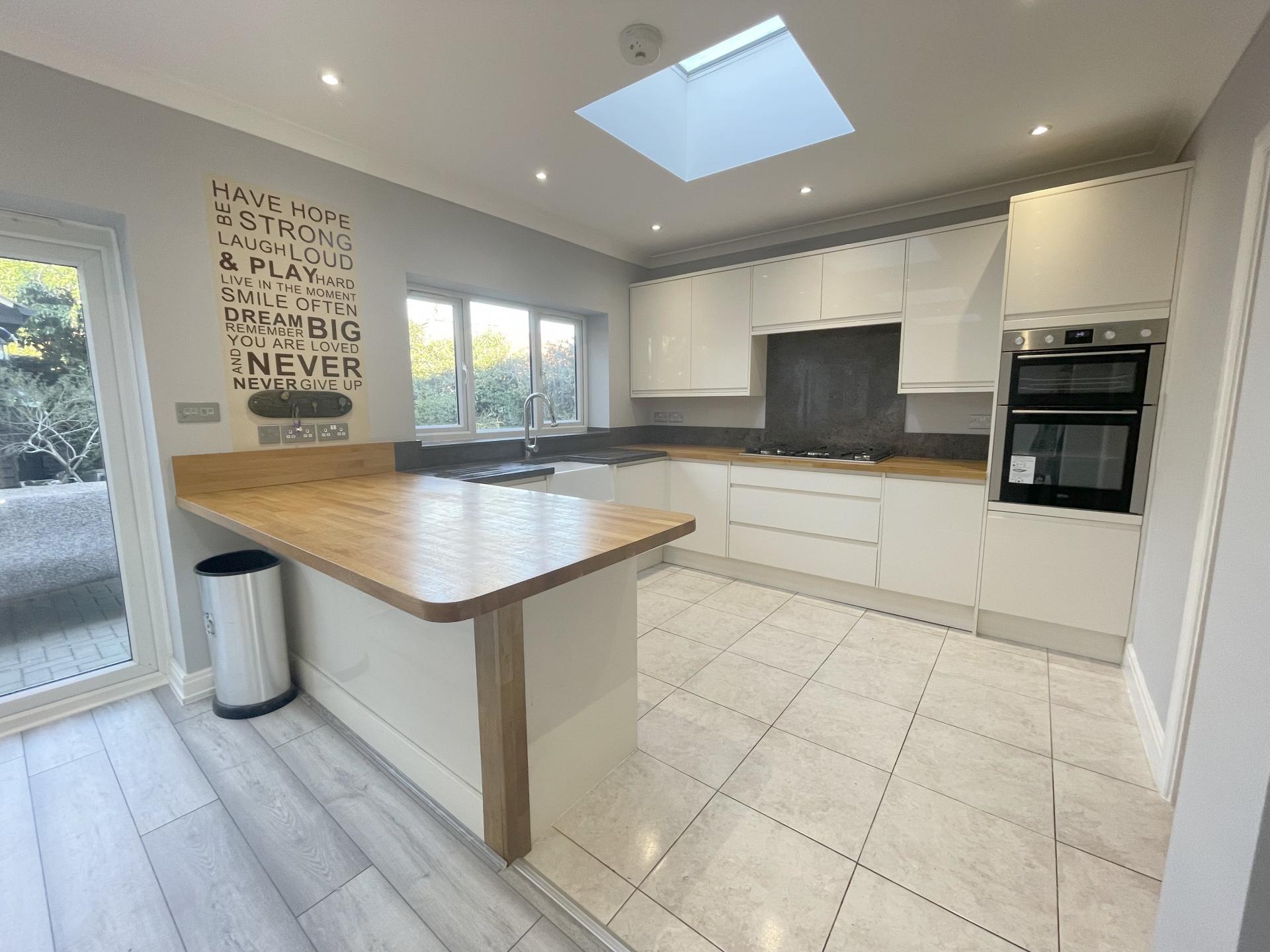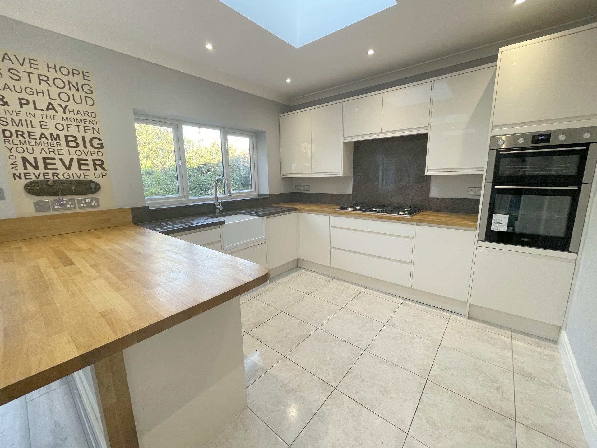 Kitchen area: Double glazed window to rear, coved ceiling, recessed spotlighting, wooden worktops with a range of matching wall, base & drawer units, 5 ring gas hob with granite backsplash, built in electric oven/grill, integrated dishwasher, butler sink with granite surface/drainer & matching upstands, tiled flooring, heated towel rail, roof light, door to utility room.