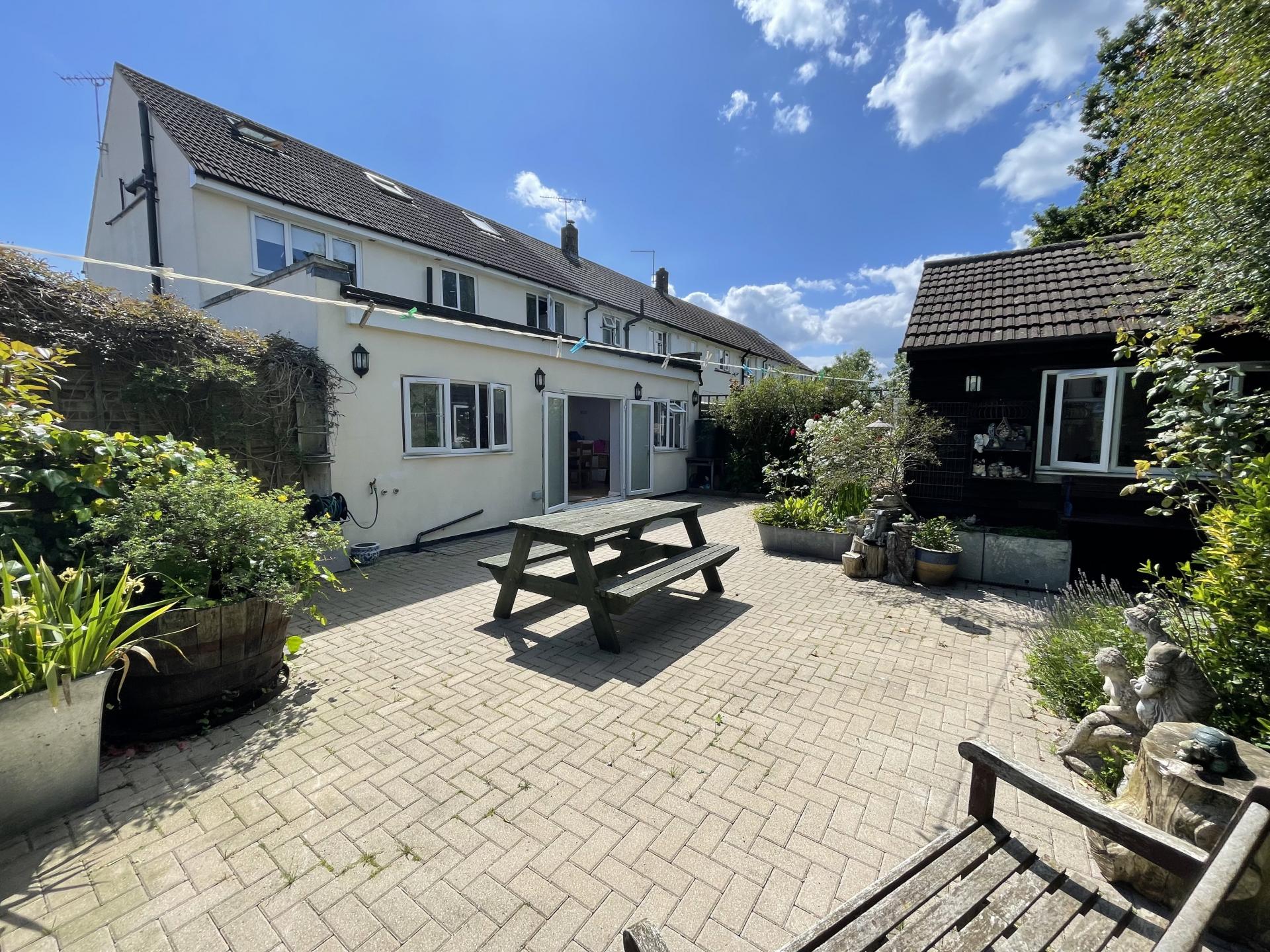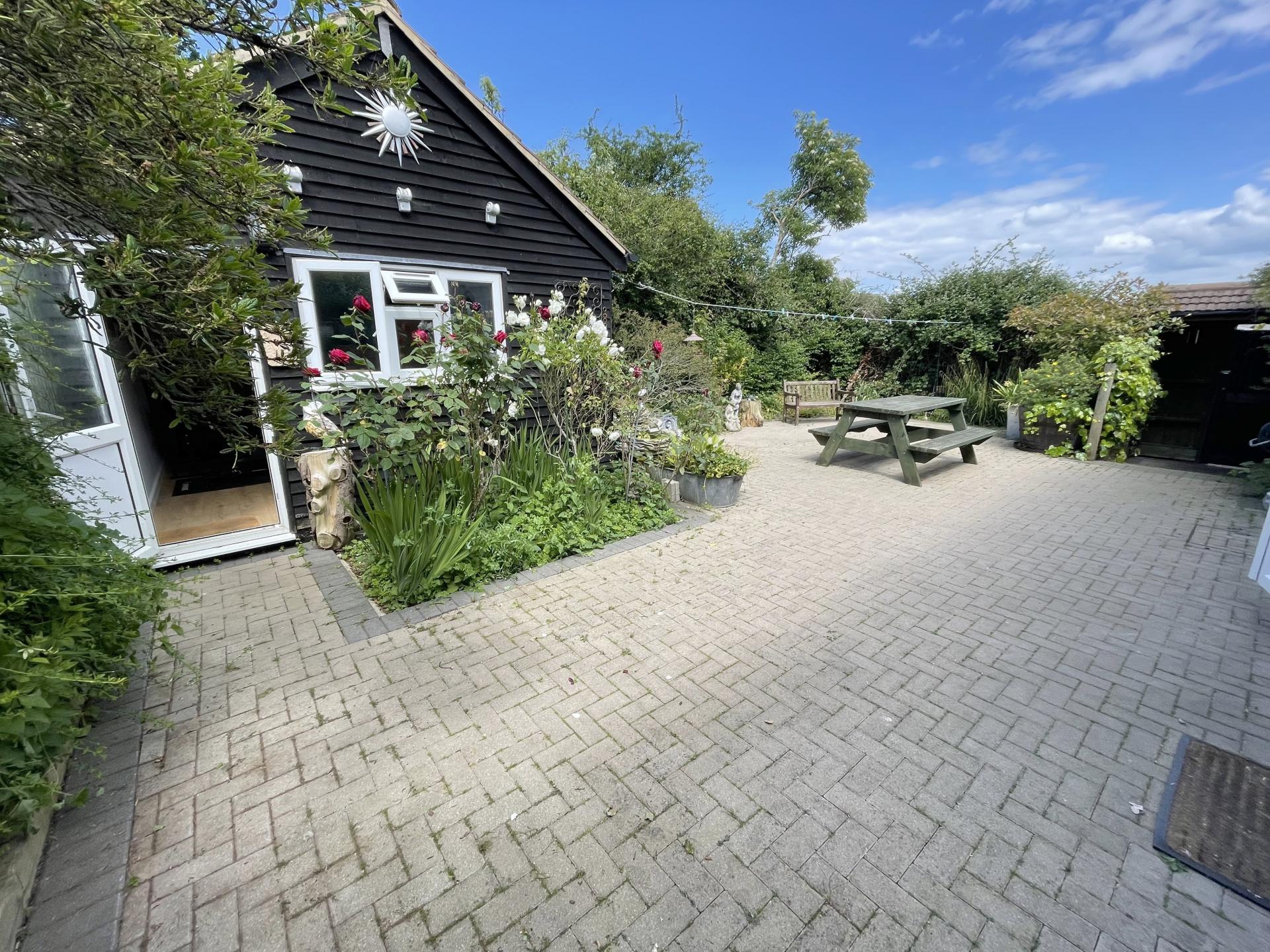 Mainly paved with a range of flower & shrub beds & borders, ornamental pond, additional trees and shrubs, outside tap, outside lighting, external power points, access to garden room with concealed storage behind, gated side access leading out to garage block.