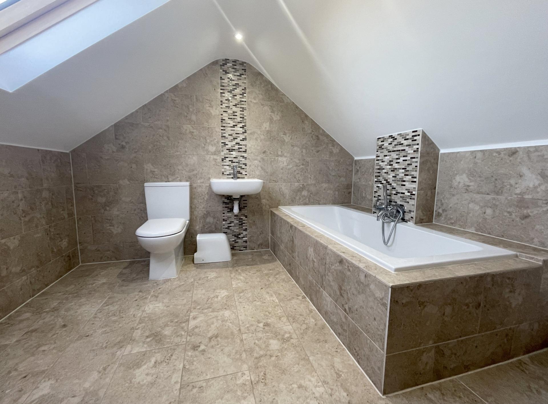 Roof window to rear, recessed spotlighting, low level w.c, wash hand basin with mixer taps and mirror above, tiled enclosed bath with mixer taps and sprayhead, tiled walls, tiled floor, heated towel rail, access to eaves storage.